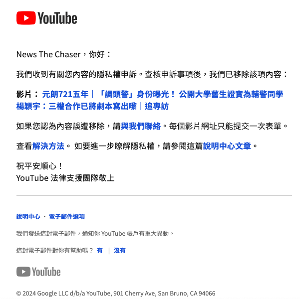 Video unavailable (無法提供影片)。」被YouTube下架的《追新聞》影片,題為:《元朗721五年|「調頭警」身份曝光! 公開大學舊生證實為輔警同學 楊穎宇:三權合作已將劇本寫出嚟》,在YouTube、FacebookInstagram的瀏覽次數分別高達134,382、241,78358,630人次,92日即《教育刺針》爆出「調頭警」身份翌日,在YouTube《追新聞》頻道上架。不過,YouTube 927日即影片播出後逾3星期通知《追新聞》,指他們收到隱私權申訴後經查核決定移除該片;指若認為內容誤遭移除,可聯絡YouTube。《追新聞》之後就事件向對方作出「上訴」。