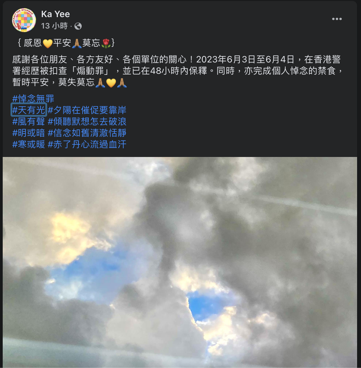 周六(3日)香港「天安門母親運動」代表劉家儀與前支聯會義工、前常委關振邦在維園禁食悼念六四,被香港警方以「涉嫌作具煽動意圖行為」及「公眾地方行為不檢」拘捕。台大研究生協會翌日在六四晚會舉行前召開記招聲援本身是台大城鄉所研究生的劉家儀,呼籲台大校長陳文章介入協助。香港保安局同日晚上11是25分發新聞稿,反批協會指控失實,予以譴責。劉家儀之後在Facebook個人專頁發帖表示,已在48小時內保釋。台大研究生協會會長許冠澤向台媒中央社證實劉家儀已獲保釋,目前先讓劉家儀休息;台大校方據報亦有就事件與台大研究生協會接洽。