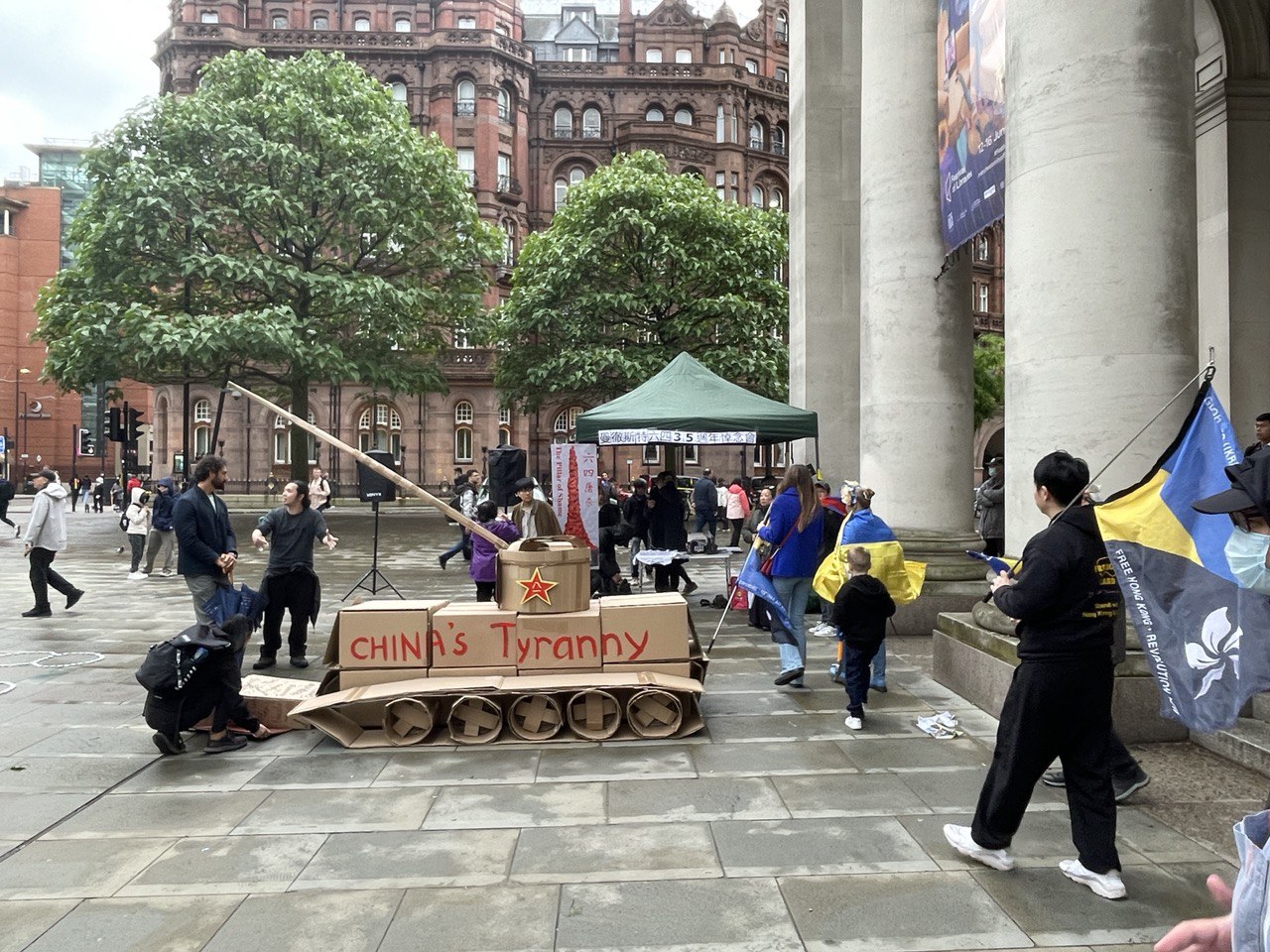 周二傍晚在曼城的聖彼得廣場(St. Peter’s Square)舉行一連兩場與六四相關的集會,逾300名在英港人出席。首場集會以對抗中俄邪惡軸心為主題,除了悼念天安門死難者,同時關注西藏、新疆、烏克蘭、格魯吉亞等分別遭中俄極權打壓或侵略的人民狀況。大會在廣場上以蠟燭砌出「8964」字樣,並擺放一具象徵俄羅斯侵略者的紙坦克模型。烏克蘭、西藏等族群代表先後上台發言。藏族代表巴登次仁(Palden Tsering)發言時,講述西藏多年來被中共入侵、極權統治,希望世界繼續關注西藏。烏克蘭代表就呼籲國際社會團結,不能讓獨裁者任意妄為。上台嘉賓發言時亦聲援香港,強調「Hong Kong is not China」。