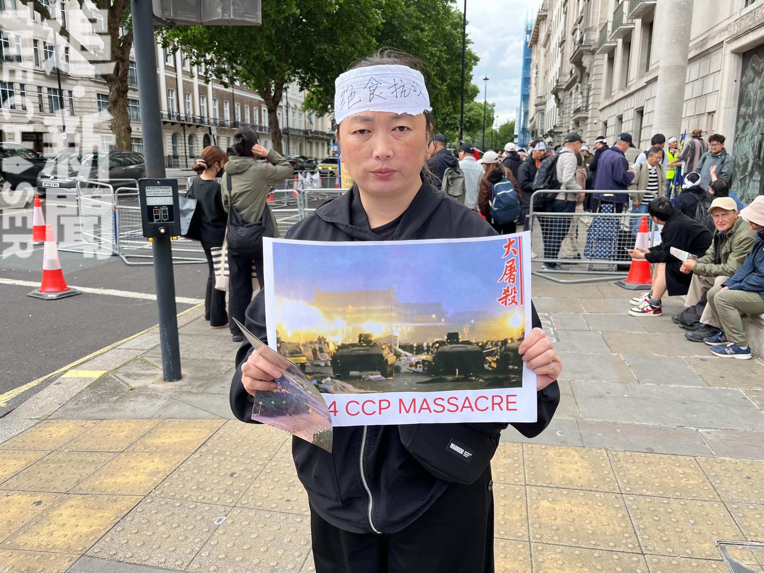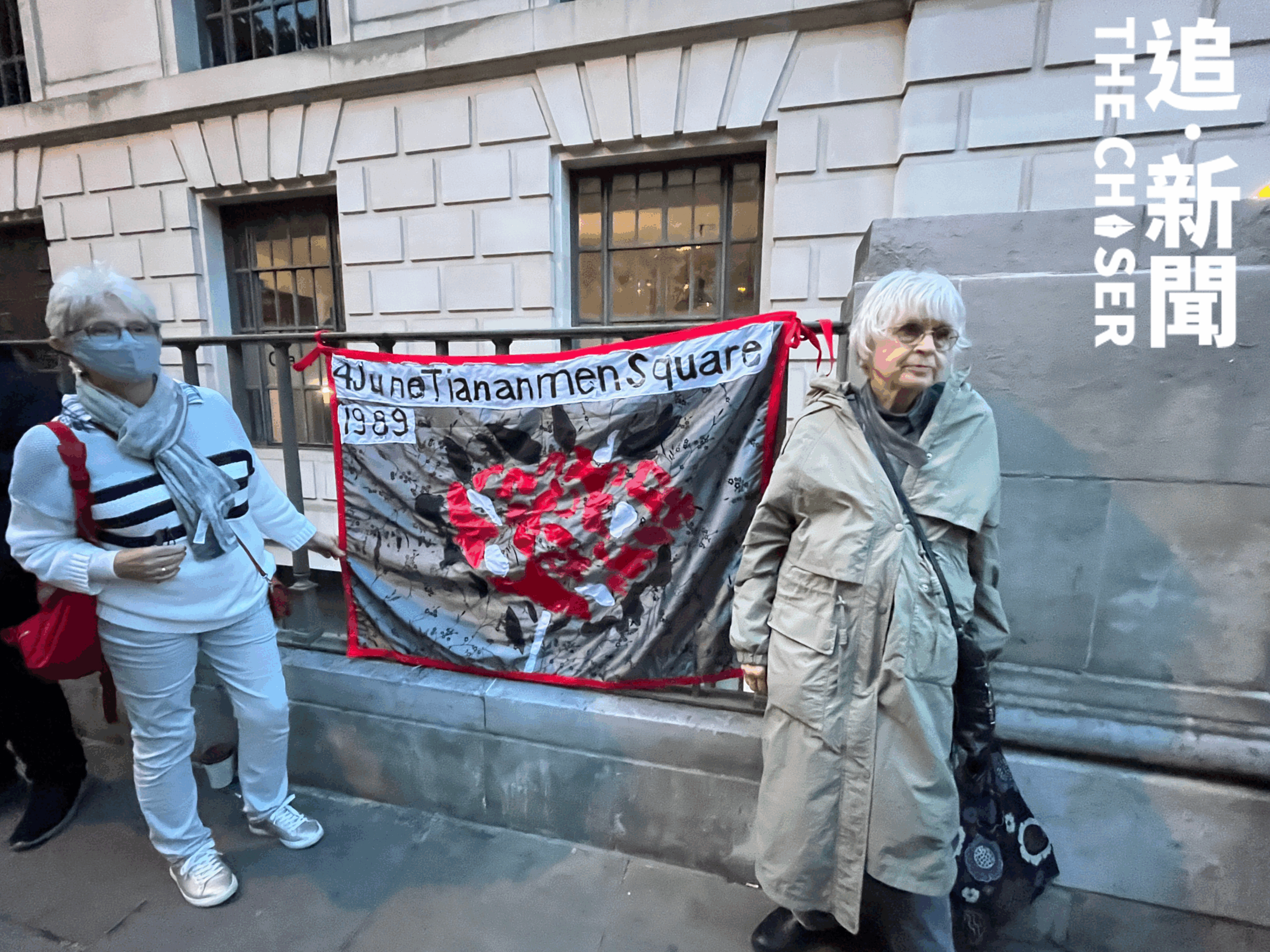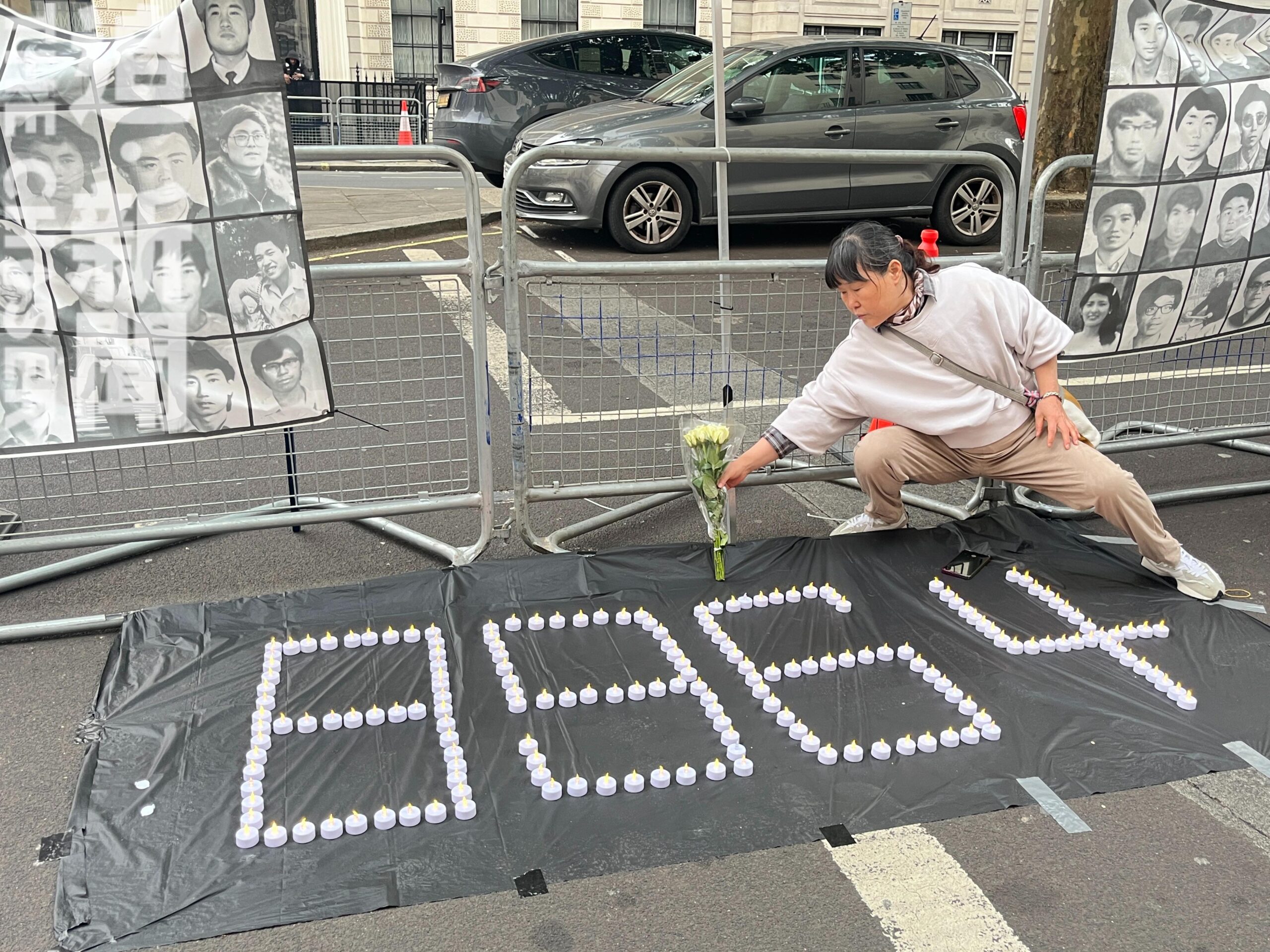 國際特赦組織會員Vrigitte與Amanda則用布碎縫製一幅橫額,表達對六四天安門屠殺的痛心。居住在南倫敦的Vrigitte向記者表示,在其居住的地方曾接獲來自中共發出的舉報信件,要求本地居民將被通緝海外港人誘到中國大使館領懸賞,她已即時向當區議員反映跨境鎮壓的猖獗。香港監察(Hong Kong Watch)信託人羅傑斯(Benedict Rogers)表示,多名海外港人遭港警懸紅通緝,而他本人與其母親也收到恐嚇信,「對我來說沒有甚麼大問題,因為沒有家人在香港,也被港府拒絕入境,但對很多香港人來說是一個警號,英國政府需要嚴肅處理跨境鎮壓問題。」