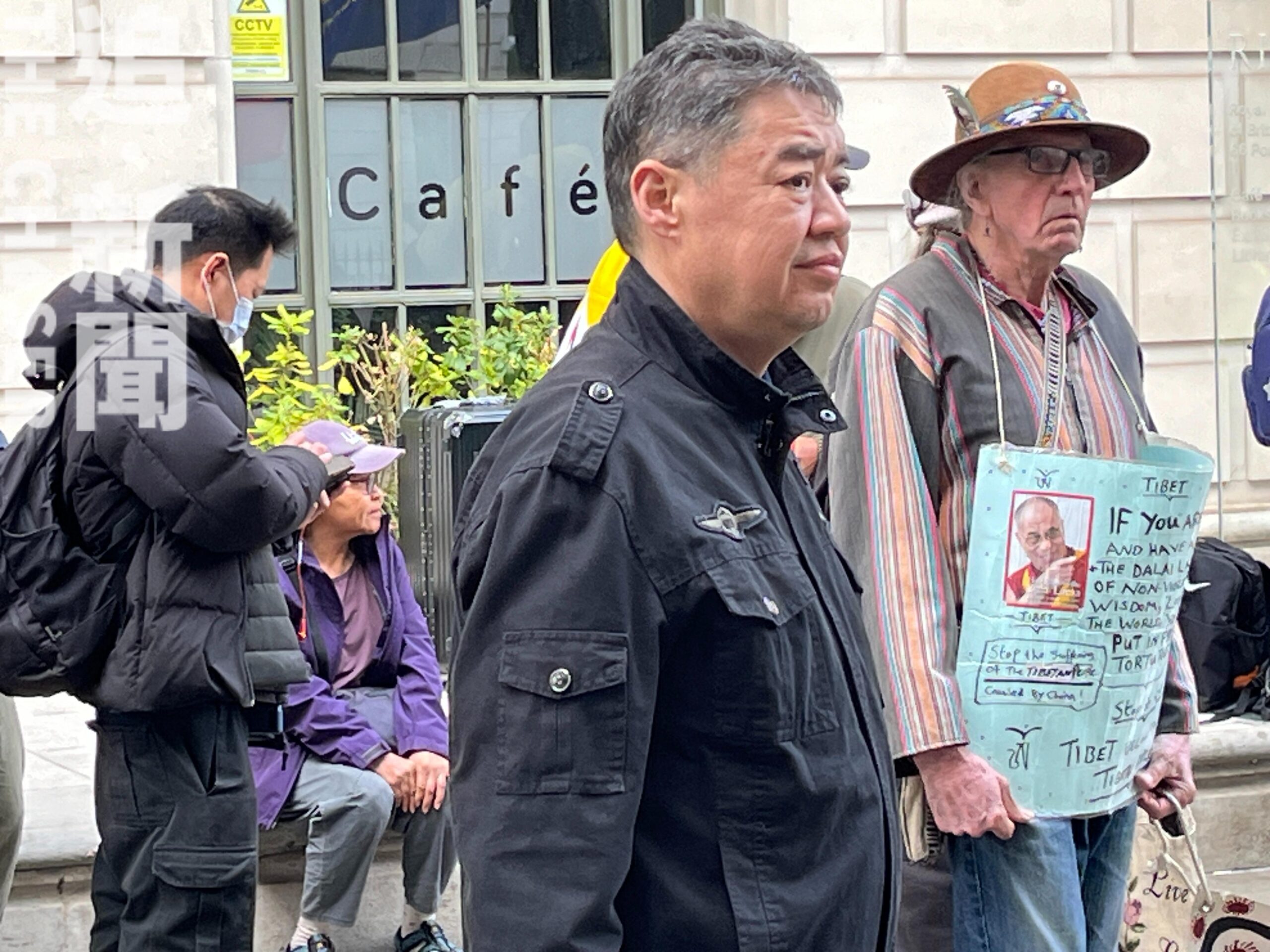 - ▲蒙兆達站在中國駐英大使館前發表六四36周年演說。