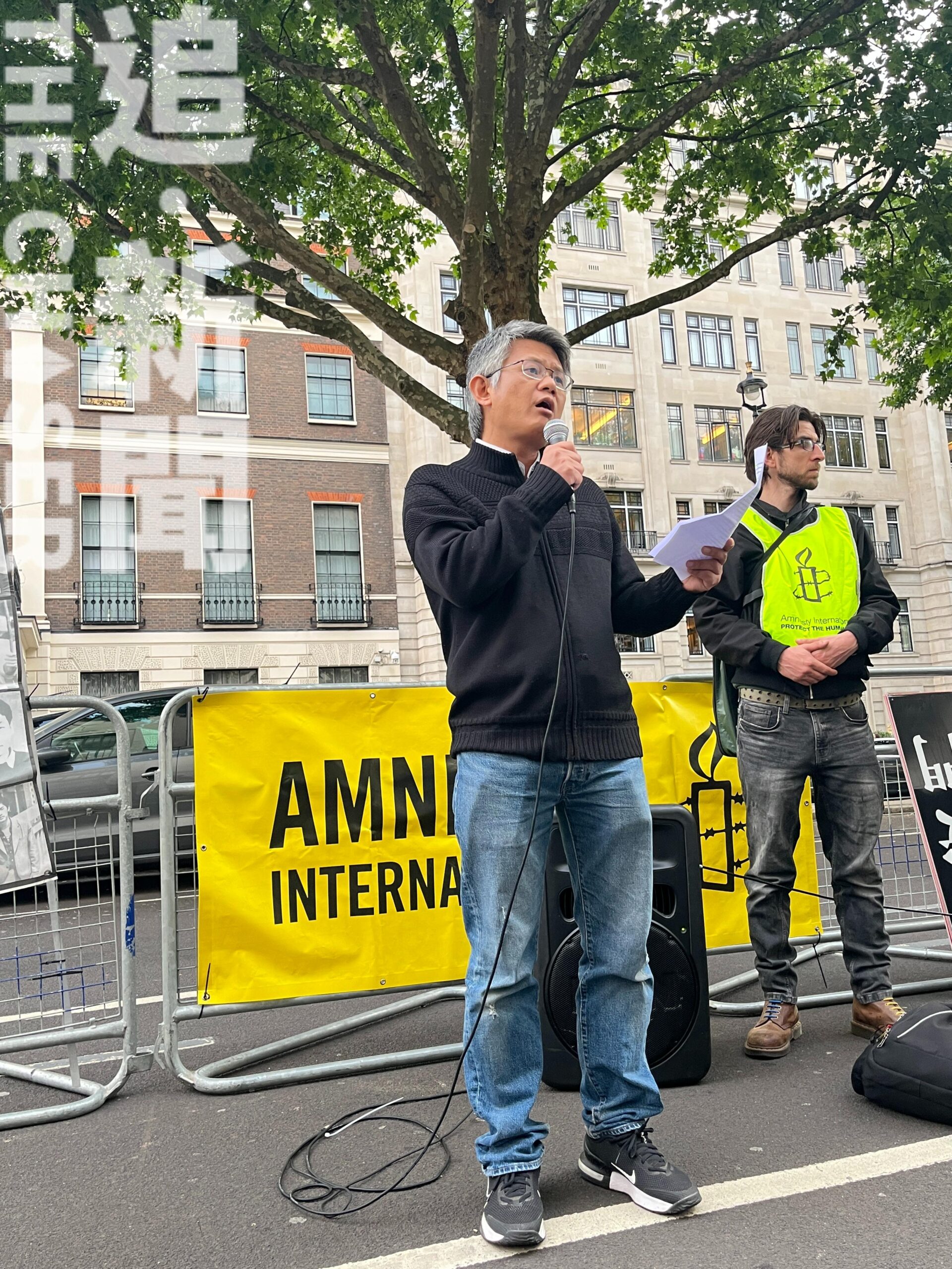 六四學運領袖吾爾開希應中國民主黨邀請前來英國,他去年2月摔落樓梯導致腦出血,身體仍在復原中,他今年參加倫敦六四集會坦言心情與參與者一樣,對於港人多年來的付出與犧牲也銘記在心。他說:「當年支聯會成員李卓人等,對我來講能夠逃離生天,被通緝之下能夠逃離中國開始流亡生涯,香港對我來說是有救命之恩,我是非常感激。」他續指,看到2019反送中運動港人的抗爭,當時也感到很焦急,流了很多眼淚,「如果我能去香港,一定會跟香港人站在一起。」吾爾開希參與下午6時由中國民主黨的紀念六四集會後,並沒有逗留至晚上8時,參加由國際特赦組織發起的六四燭光晚會。
