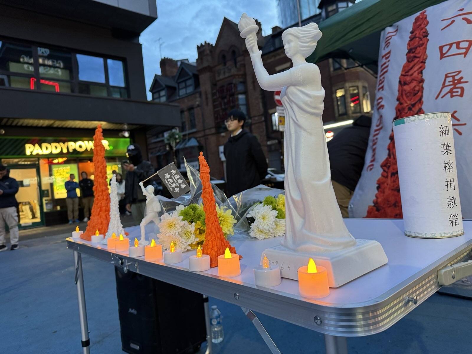 今年六四,曼城、雪埠、窩靈頓、伯明翰、諾定咸、雪埠、卡迪夫、京士頓等地都有港人舉行悼念集會。在曼城,有超過400人出席傍晚在市中心聖彼得廣場(St. Peter’s Square)舉行的一個半小時集會,參加者以中年及長者為主,亦有父母帶同年幼子女一同出席。現場寫有白布黑字的標語「釋放社運人士,結束一黨專政」,地上則以白蠟燭砌出「8964」的數字,期間大會安排播放「天安門母親」成員張先玲的錄音發言。