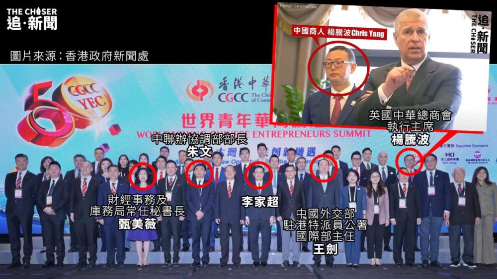 英國安德魯王子身邊一度的「大紅人」、被指是「中國間諜」的中國商人楊騰波,2023年3月被禁進入英國,同年11月出席香港公開活動,並和特首李家超以及其他人士大合照。照片顯示,李家超作為活動主禮嘉賓站在相片第一排中,楊則站在第二排右一。