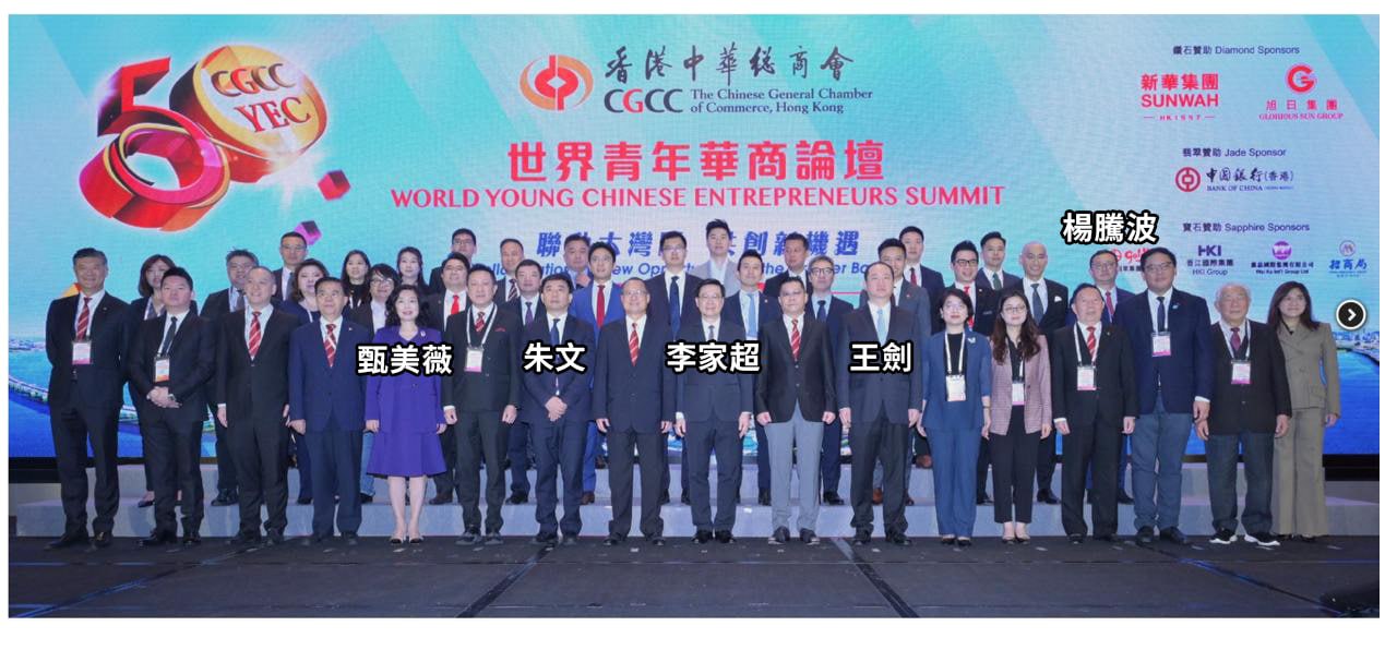 香港政府新聞處圖片顯示,是次活動為《香港中華總商會青年委員會50周年慶暨世界青年華商論壇》,日期為2023年11月16日,特首李家超結上斜紋領帶,站在第一排約中間位置(左九)。至於當時據報以英國中華總商會執行主席身份出席活動的楊騰波,則站在第二排右一,和李家超相隔5、6個身位。