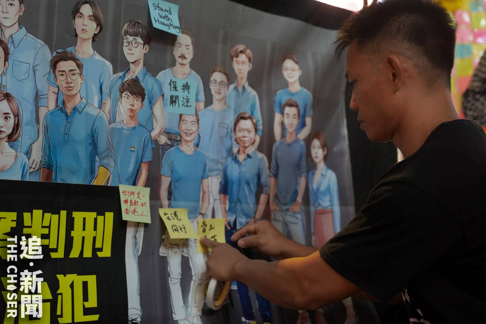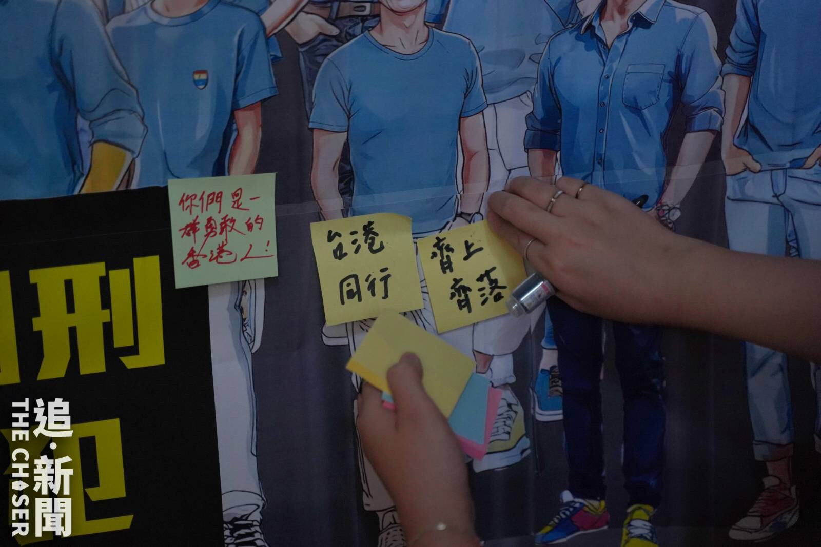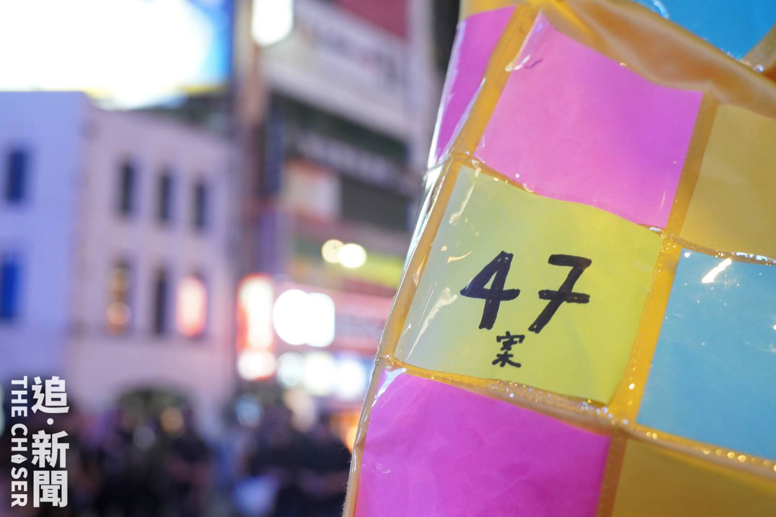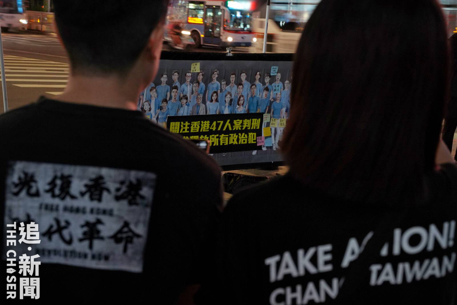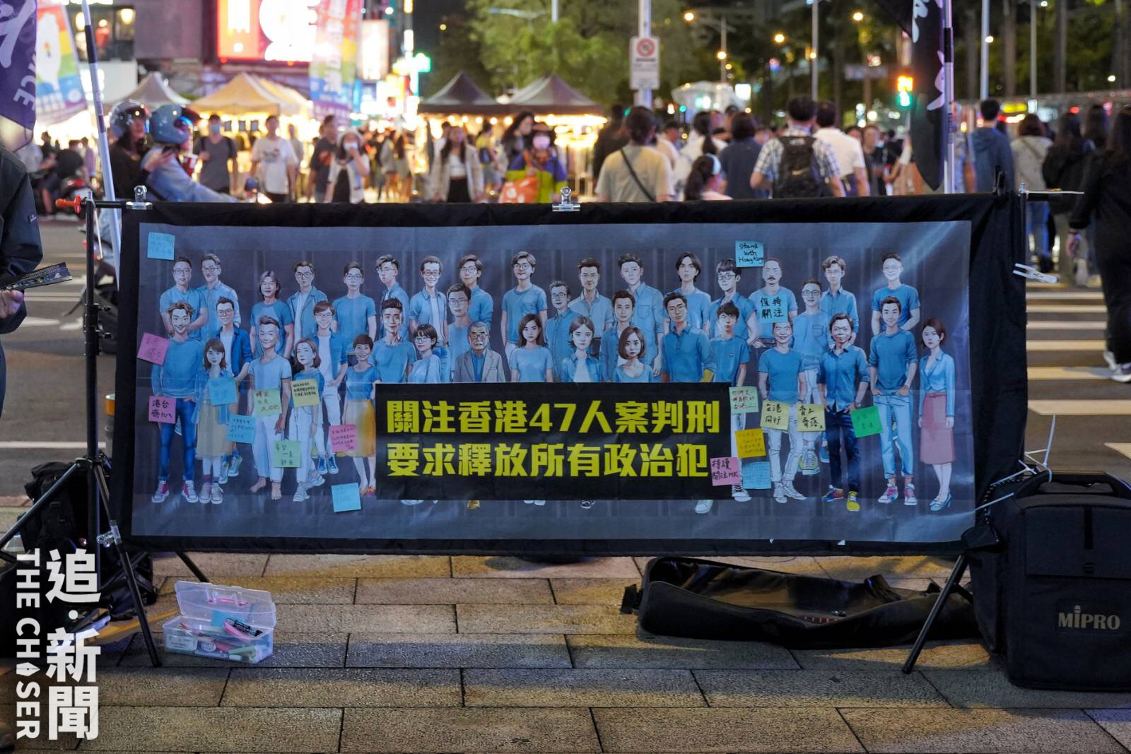「釋放香港在囚人士,制裁香港法官。」台北時間周六(16日)傍晚6時,約30人在台北西門町參與聲援香港民主派初選47人。發起人及團體拉起以47人案被告畫像製作的巨型橫額,「關注香港47人案判刑,要求釋放所有政治犯」。團體並向民眾派發單張講述案件及港區《國安法》對自由的侵害。流亡台灣港人藝術家黃國才以黃色頭盔及雨衣製成流動連儂牆,讓參加者寫下心聲及聲援字句,約30人參與行動。
