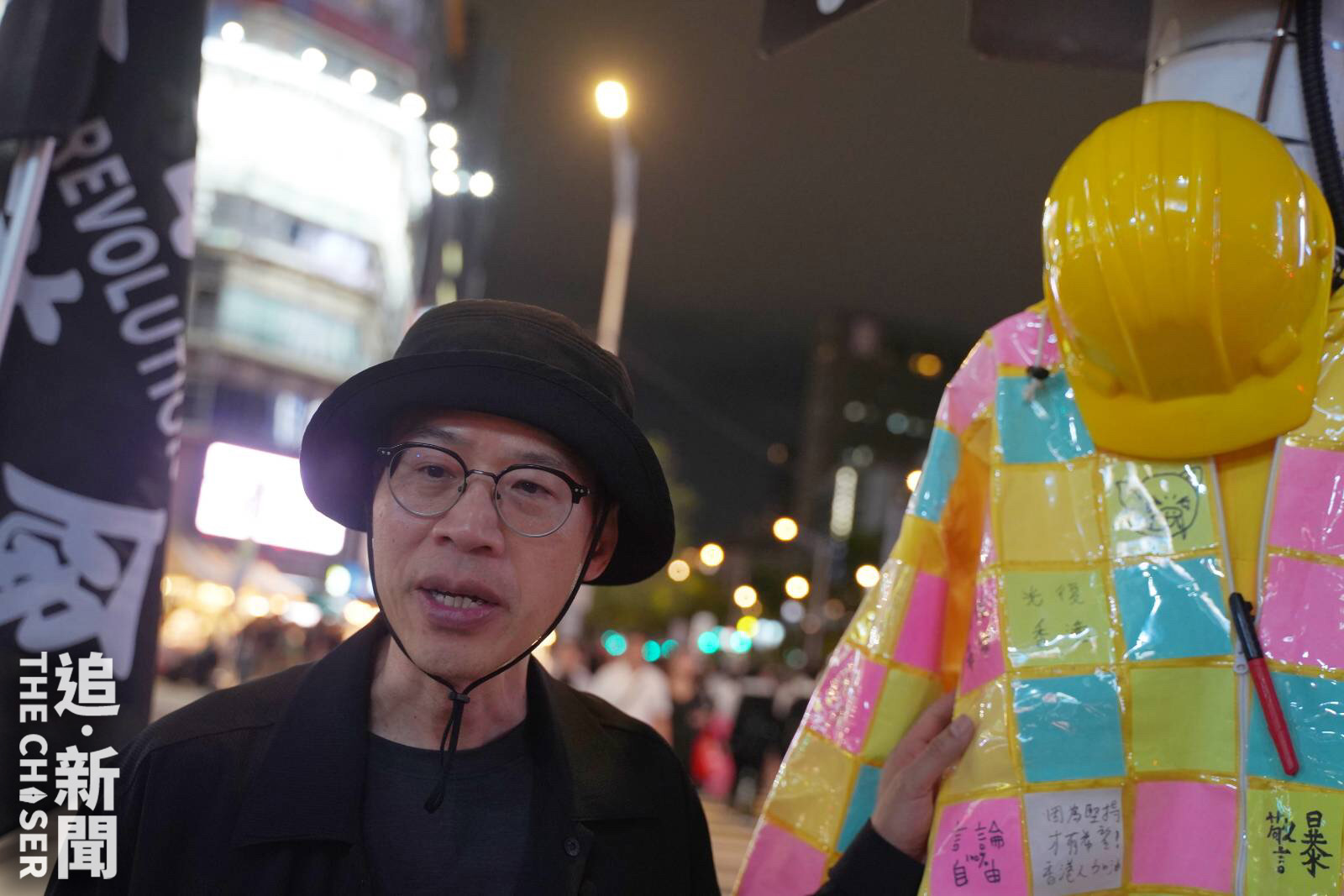 流亡台灣港人藝術家黃國才在燈柱掛起黃色頭盔及雨衣,雨衣上有數十個透明膠格,民眾可在便利貼寫下心聲並放入膠格。黃國才指雨衣由朋友於2021年設計,流動連儂牆體現「be water」精神。他表示,很多人在爭取香港民主自由過程中犧牲,黃色雨衣令人聯想起2019年6月15日在金鐘太古廣場墮斃的梁凌杰,香港現時仍有6,000多人被暴政幽禁,希望大家不要忘記在囚人士。想起為民主自由犧牲的人,他直言心情非常矛盾,當日眼見初選47人被捕,遂決定離開香港走上流亡之路:「47人案正代表我哋原本理解嘅法律變成武器,對付爭取民主自由嘅香港人,係唔可以接受」。