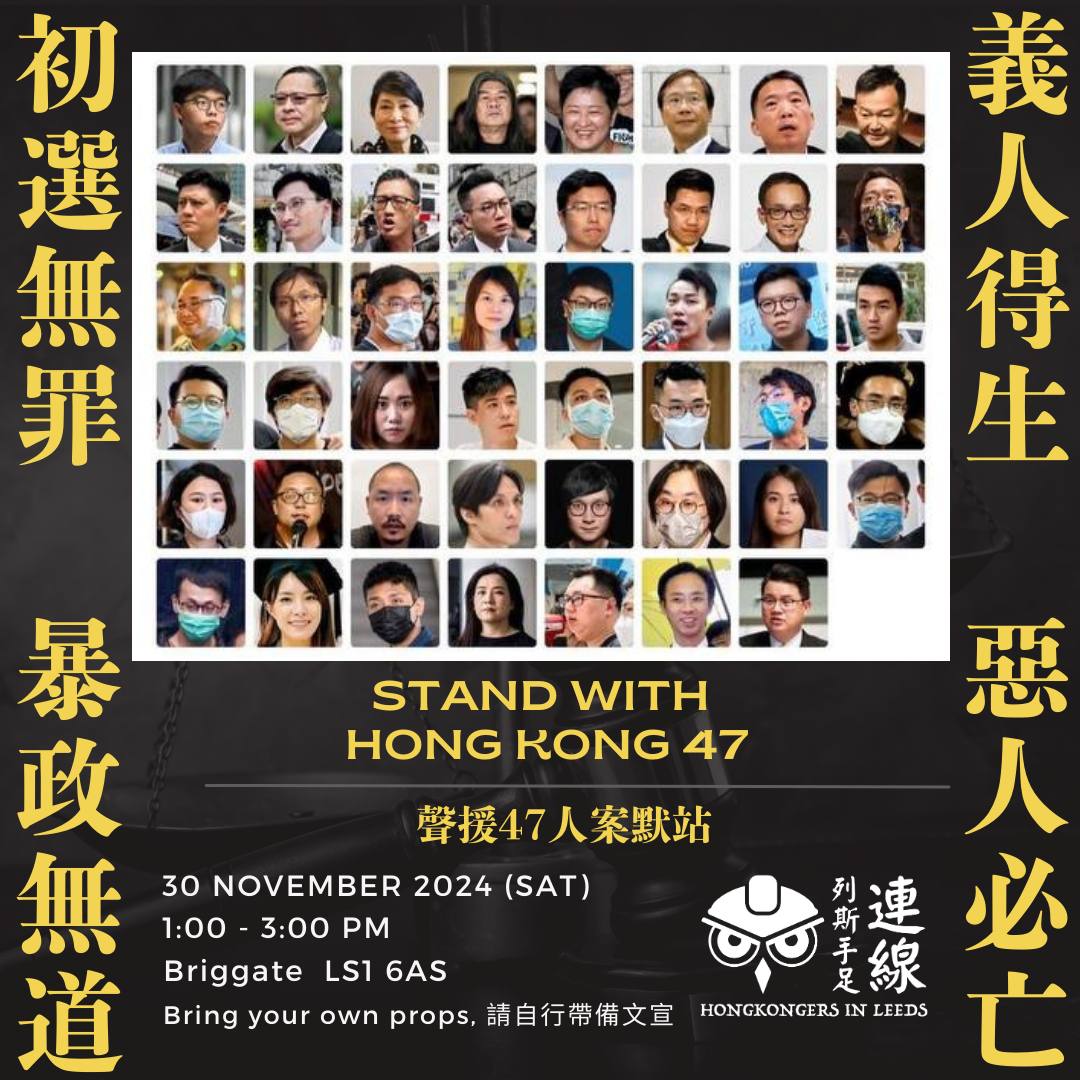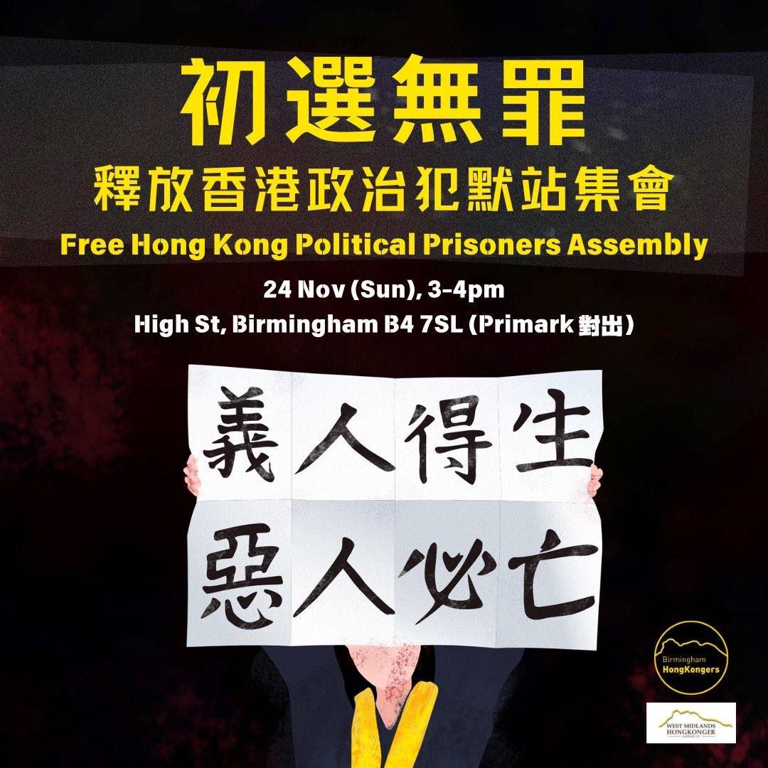 「初選47人案」是香港國安法實施以來最大宗單一案件,案中45人僅因為參與及舉辦一場民主初選而被判監四至十年不等— 爭取民主自由就是他們的罪名。連同早前宣判的國安法案件,香港已經湧現大量政治犯。今個星期日,讓我們一起在伯明翰市中心聲援身陷牢獄的手足,並高呼釋放所有政治犯!