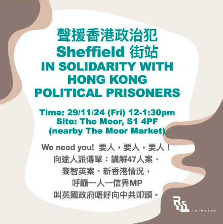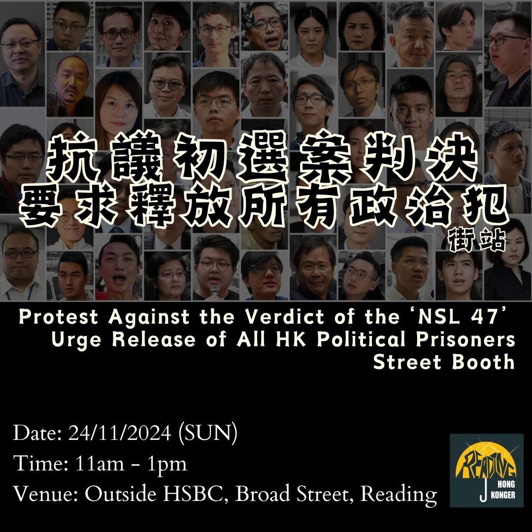 詳情: 民主派初選案判刑,45人被判監4年2個月至10年不等,令人感到無比悲憤,冤獄一天都嫌多。本週日,我們將擺設街站,希望喚起當地居民關注事件,一起去信國會議員,要求英國政府向香港和中國政府施壓,釋放所有政治犯。