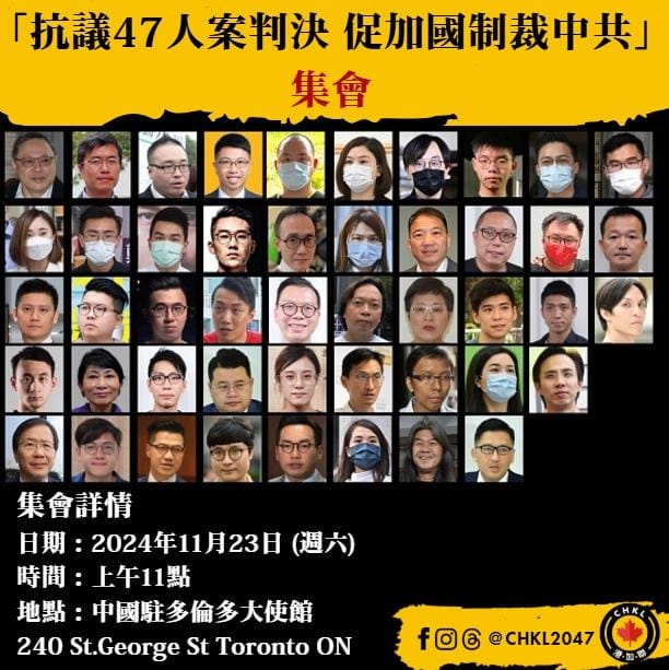 香港最大國安案、初選47人案11月19日判刑,45名罪成被告被重判4年2月至10年。海外港人全球發起集會聲援47人,要求各國向香港和中國政府施壓,釋放所有政治犯。