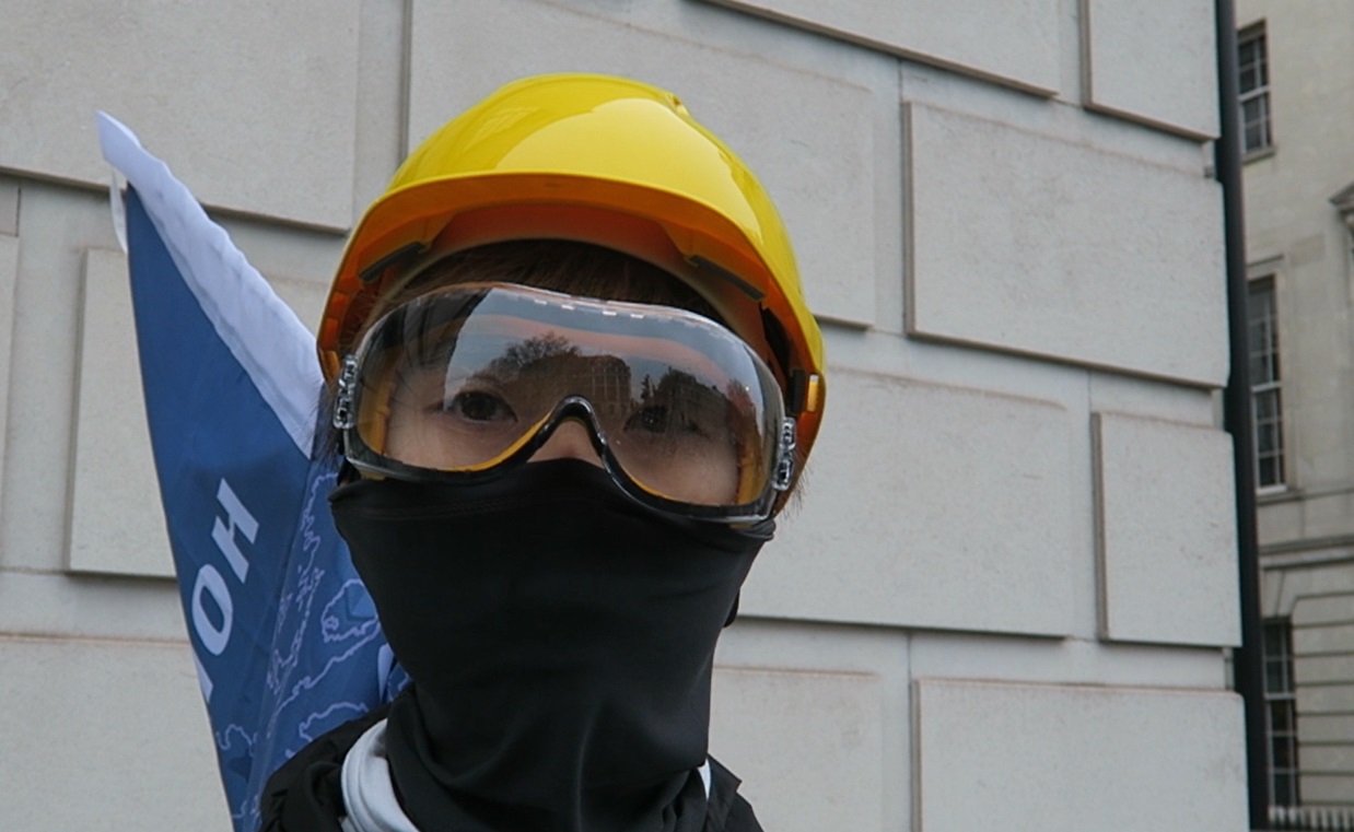 - ▲ 示威者Issac戴上頭盔、面罩參與集會。