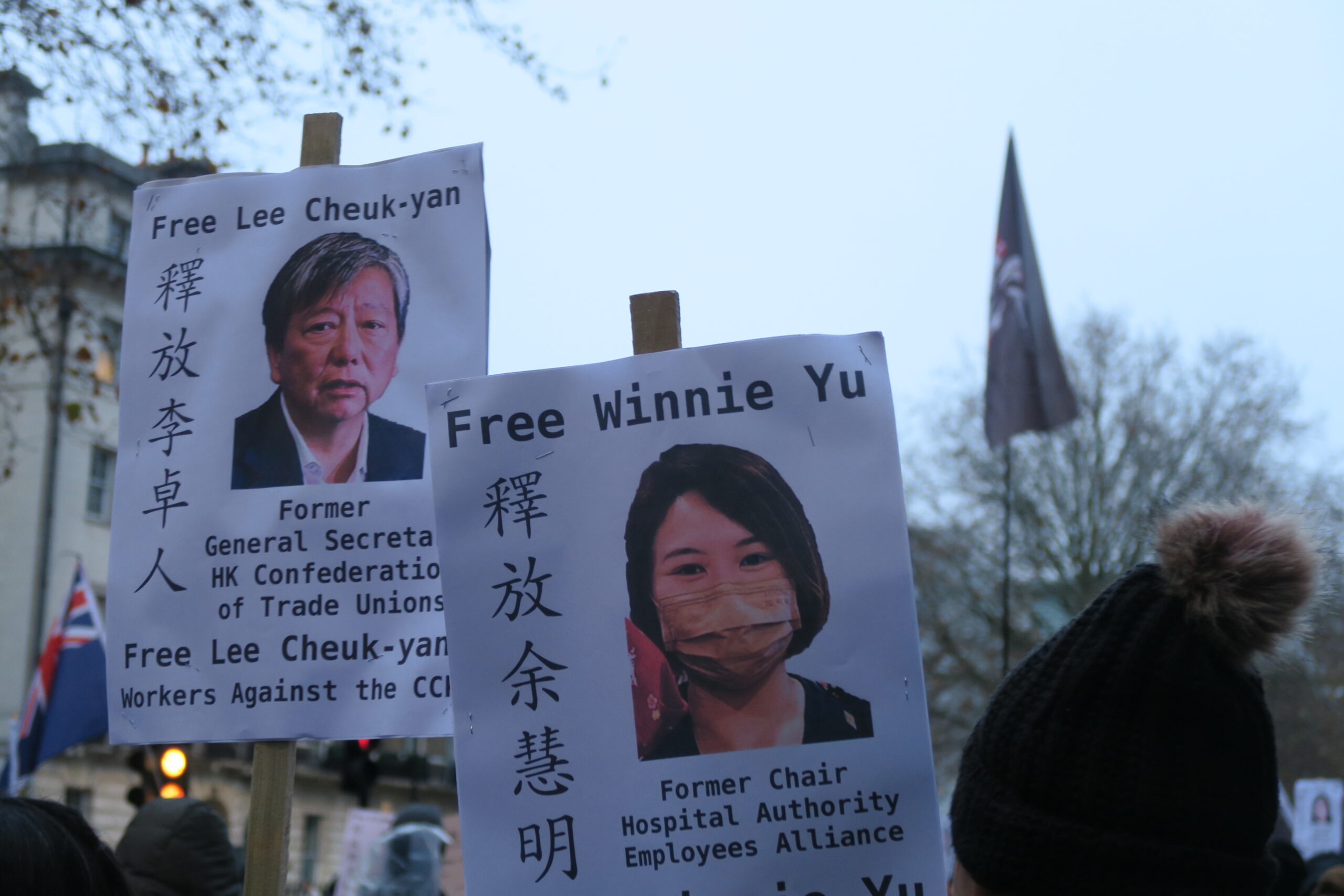 集會於當地時間下午3時在中國駐英國大使館外舉行,集會人士舉起「釋放李卓人」、「釋放吳敏兒」、「釋放余慧明」等紙牌,聲援因港區國安法被控的工運人士。港人青年Issac這天戴着頭盔、眼罩和面罩出席集會,如同2019年反送中示威期間的參與者一樣,他表示這身裝束是希望在表達支持初選案被告以外,同時表達對中大、理大事件以至其他案件的示威者的支持,「我哋冇忘記到你哋」。Issac形容初選案47名被告是「手足」,「包括民主派、泛民同本土派嘅人」,希望支持他們,「佢咃畀人『拋』(還柙)咗都好耐」。