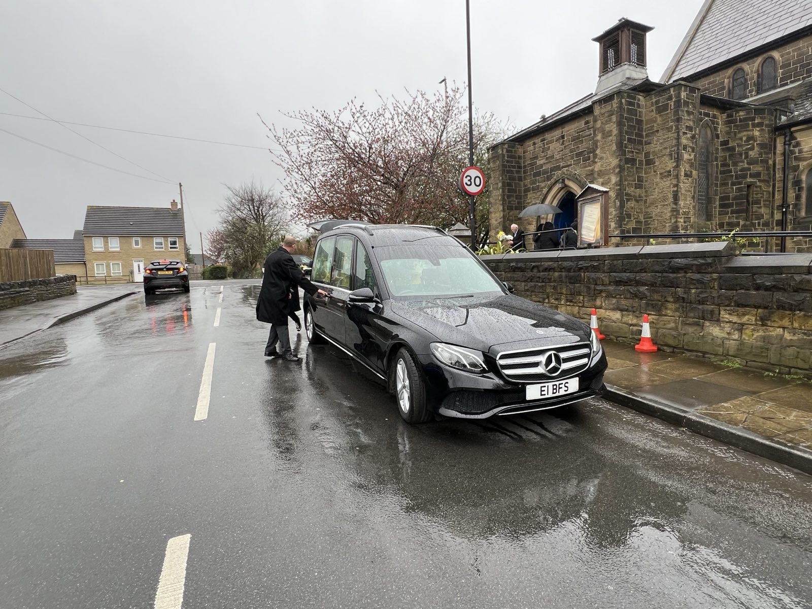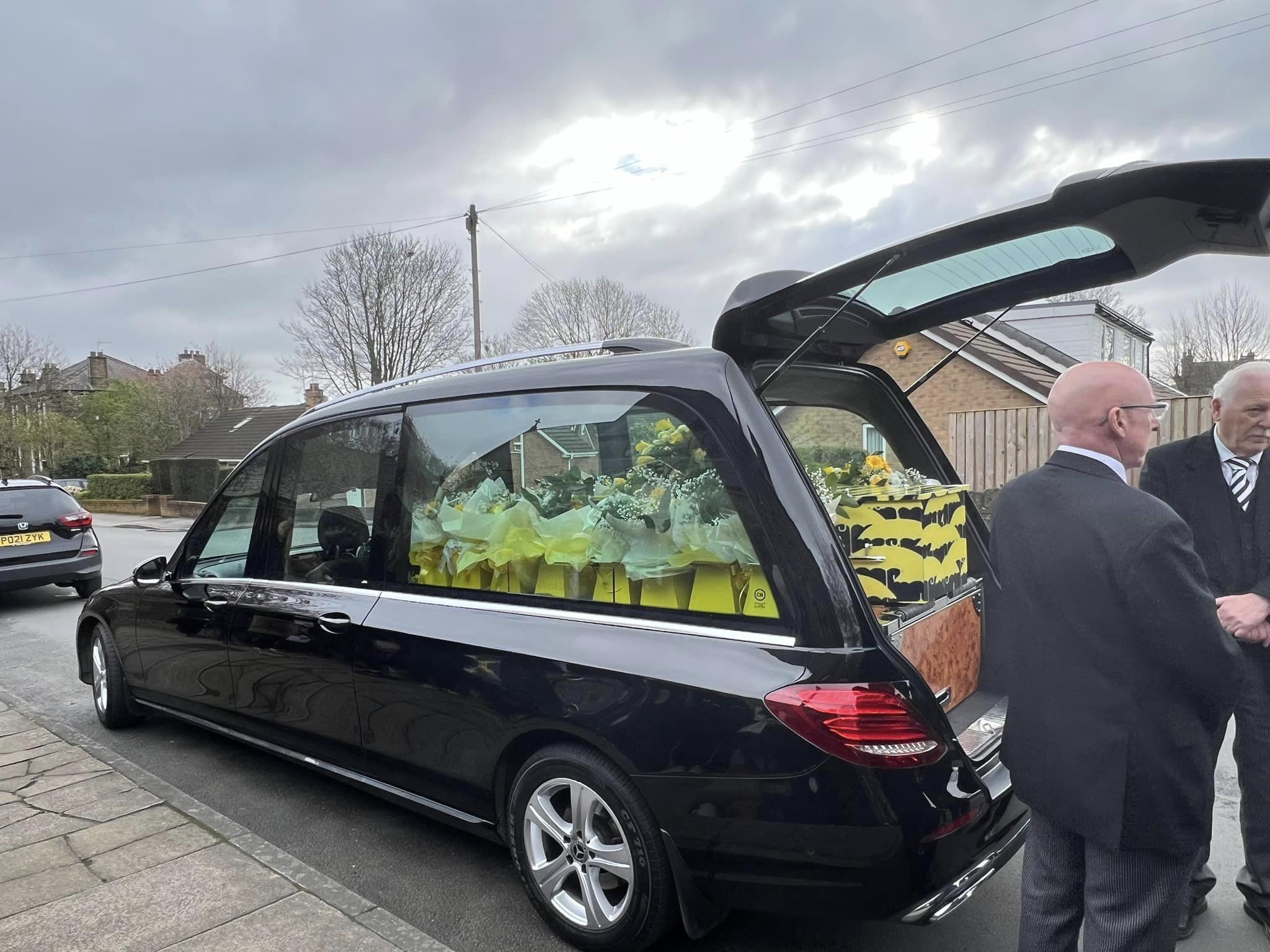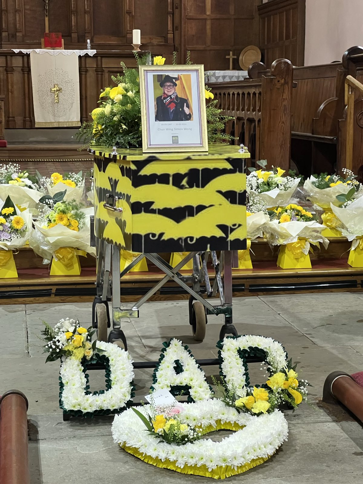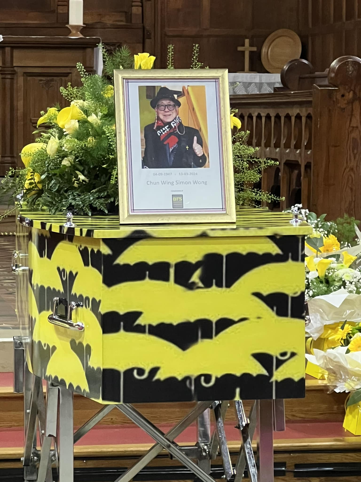 在英國初春的絲絲細雨,細黃伯的葬禮在英國列斯(Leeds)一間小教堂Saint Andrew’s Church Bruntcliffe舉行,葬禮以黃色為主調,棺木髹上黃傘,細黃伯的遺照豎起大拇指,胸前別上「黃傘」的小襟針,份外醒目。