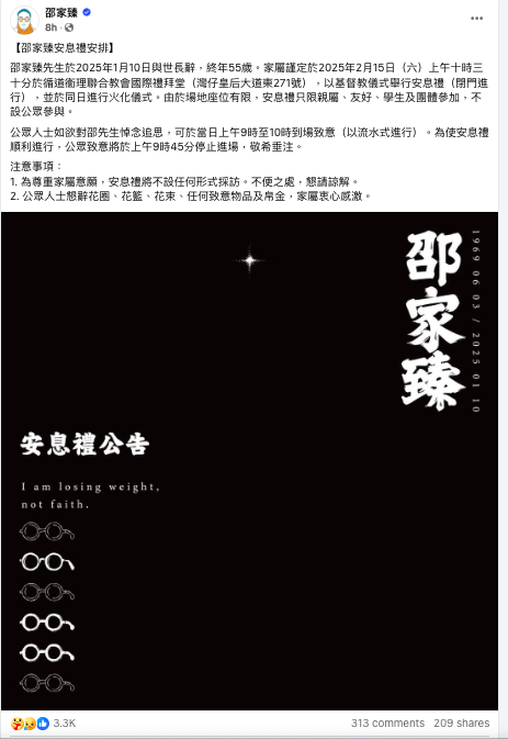 邵家臻安息公告以英文寫道:「I am losing weight, not faith. (我減重,但沒失信主決心)」,並以邵家臻的招牌圓框眼鏡點綴。Facebook3,300讚、Instagram1,832讚,網民留言:「主懷安息,天家再見,多謝你對香港人的付出!」「當跑的路已跑盡!當守的道已守住!願您安息主懷。」