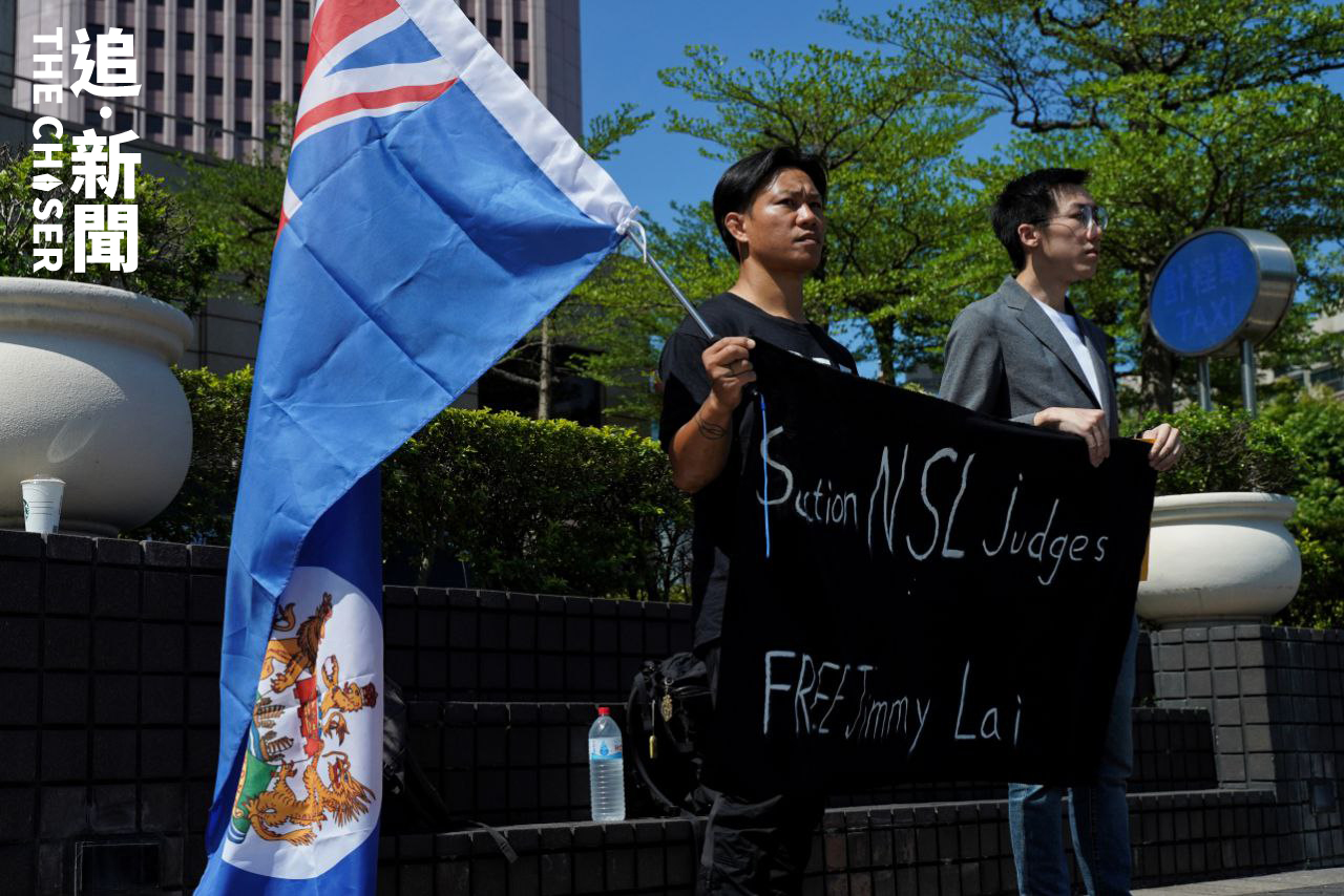 卓慧思發表演說前夕,流亡台灣港人「赴湯」湯偉雄及前中大學生會外務副會長羅子維上午9時許帶同寫上「Sanction NSL Judges,Free Jimmy Lai(制裁國安法法官,釋放黎智英)」的橫額到場請願。