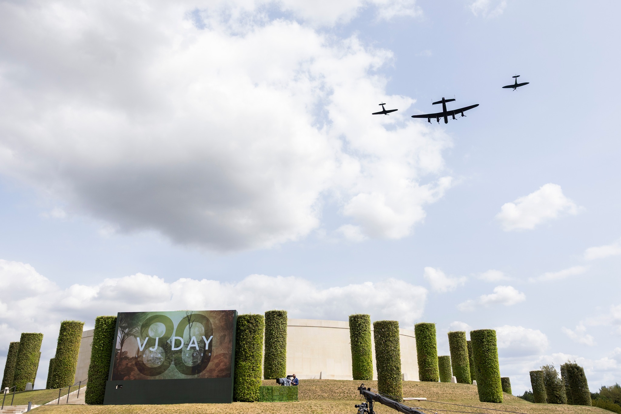 VJ 80周年當日,英國各地由地方教會、市政府等機構都以不同方式紀念,皇室除了發佈英皇電視講話外,查理斯三世就是正正在國家紀念花園,與仍然在世的二戰老兵、以及他們的後裔見證「紅箭」機隊以及3架二戰軍機在頭上飛過。