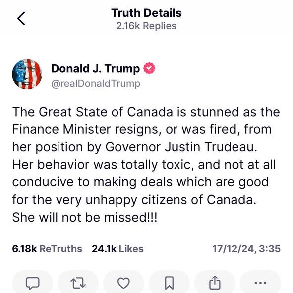 加拿大總理杜魯多(Justin Trudeau)陷上台以來最大執政危機。副總理兼財長方慧蘭(Chrystia Freeland)突然辭職,表明與杜魯多在應對美國候任總統特朗普(Donald Trump)擬加徵關稅的立場上有嚴重分歧。事件再度觸發執政自由黨內對杜魯多的逼宮,多個在野黨派亦促請杜魯多下台。加國傳媒指,杜魯多正考慮辭職或提前大選。特朗普在社交平台發帖,再次稱呼杜魯多為加拿大州州長