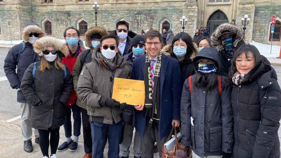 - 加拿大保守黨議員Garnett Genuis接過聯盟請願信,答應會將Stream B問題帶到國會辯論。(香港監察提供圖片)