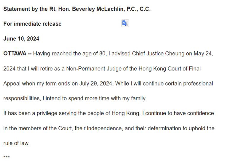 繼上周香港終審法院兩名來自英國的非常任法官郝廉思勳爵(Lord Lawrence Collins)與岑耀信勳爵(Lord Jonathan Sumption)請辭後,加拿大法官麥嘉琳(Beverley McLachlin)周一(10日)發表聲明指,已向香港終審法院首席法官張舉能表明,因她已年屆80歲,當今年7月29日終審法院非常任法官任期屆滿後,不再續任,計劃花更多時間陪伴家人。她在聲明中重申,為港人服務感到榮幸,有信心法院成員的獨立性及維護法治的決心。香港司法機構證實相關消息。