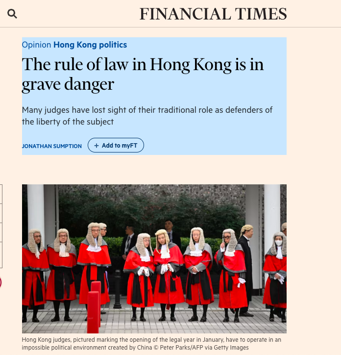 文章認為,香港司法部門顯得日益萎靡,而在香港法官受到美國制裁威脅下,雖然他們大多是抱持普通法自由主義本能的正直者,但卻要在中國創造不可能的政治環境中繼續工作。岑耀信分析指,問題出於《港區國安法》和早已廢除的殖民地過時法例《煽動叛亂法》,這種不自由的法律大大限制了法官的執行判決的自由;其次就是法官都明瞭根據《基本法》規定,若然中國政府不喜歡法院裁決,可以通過北京全國人大常委會的「解釋」推翻判決,並以《壹傳媒》創辦人黎智英聘用英國御用大律師Tim Owen的案例,反映中國政府利用這項權力對付反對者。