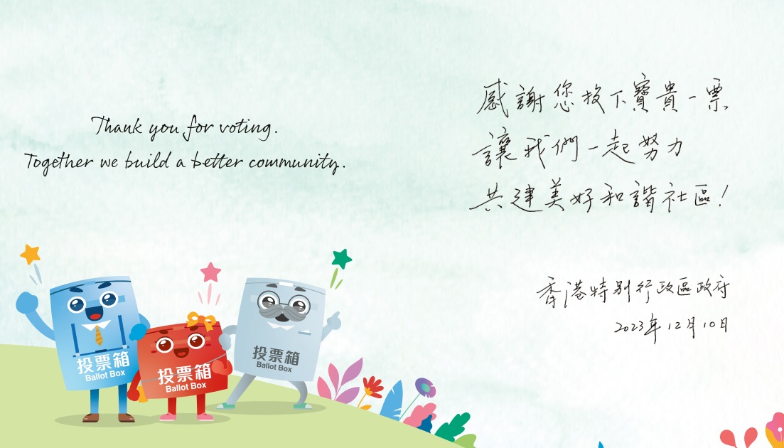 特區政府發放的「心意謝卡」圖片顯示該卡分為兩頁,正面為「共建美好社區」大標題,附近獅子山、昂坪360纜車、青馬大橋、海洋公園吊車、郵輪碼頭、文化中心和金紫荊廣場等繪圖,背面則有「感謝你投下寶貴一票,讓我們一起努力,共建美好和諧社區!」字樣,署名為「香港特別行政區政府」。當局表示心意卡設計源於「全港各區的著名景點及地標特色共同設置在獅子山下」,形容安排「純為與民同樂」。