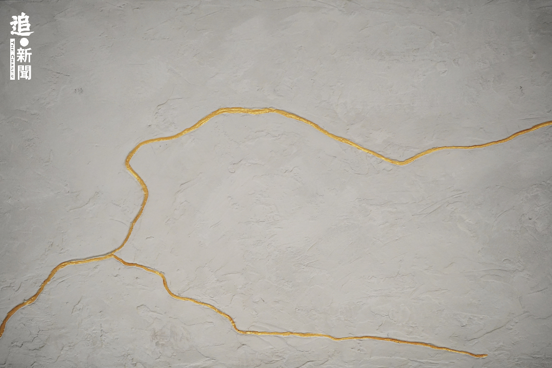 話鋒一轉,眾人焦點落吧檯金漆獅子山山線上。Chris介紹這道山線由他們合力刻鑿而成,參考了日本「金繼」工藝。他指,「金繼」承繼破裂,強調擁抱破損﹑接受缺陷成為生命的一部分,但「唔一定講香港,而係每一個生命,除咗香港新移民,還包括烏克蘭同阿富汗人,個個都有自己go through嘅事情。」