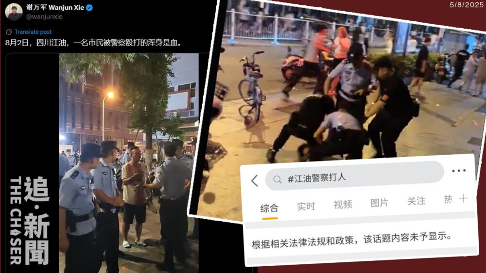 「又不是沒進去過,以為我們怕你(報警)嗎?沒得20分鐘就出來了!」四川成都世界運動會周四(7日)揭幕前夕,毗鄰江油市逾千名群眾不滿公安對14歲女生遭欺凌案件處理手法過輕,周一(4日)在市政府辦公室前聚集抗議,與大批公安、黑衣特警對峙。警方翌日凌晨暴力清場,出動警棍、電擊棒毆打市民,現場據報留下斑斑血跡。網絡影片顯示,江油市面周二(5日)氣氛緊張,儼如戒嚴,道路被封,遍布警察,公安無預警邊拉人邊噴辣椒水,有相信便衣警察入夜後混入人群突然拘捕市民。當局亦據報大舉封鎖消息、實施網禁,部份地區無法用手機進行視像直播。