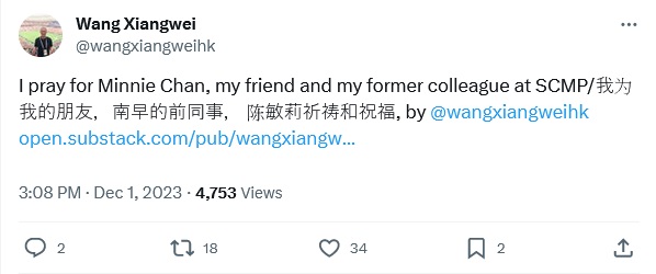 ▲ 《南早》前總編輯王向偉於社交網站祝福陳敏莉平安。