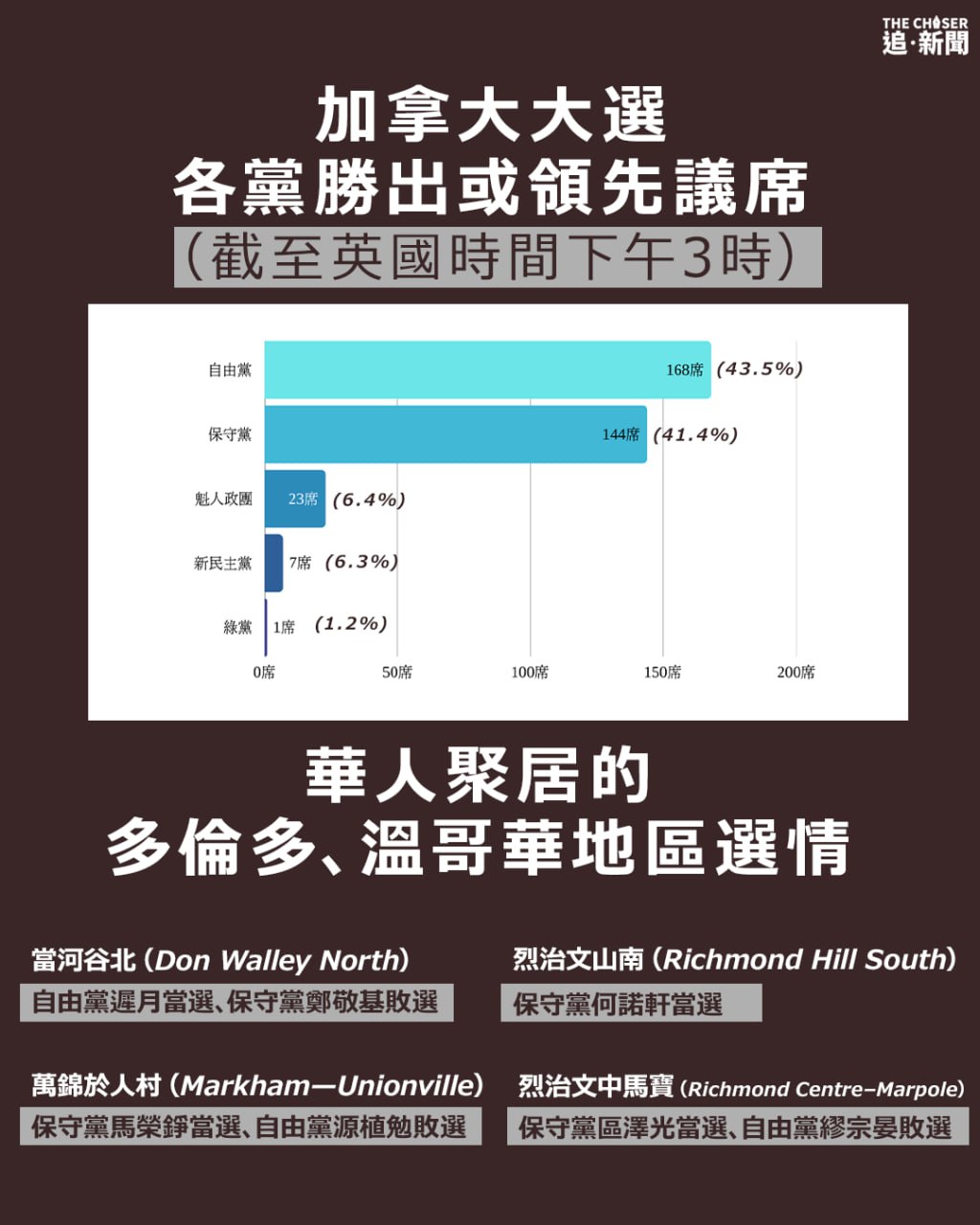 加拿大周一(28日)舉行大選,矢言要帶領加拿大走出美國總統特朗普引發的經濟危機的總理卡尼(Mark Carney),率領自由黨贏得國會選舉,截至英國時間周二(29日)下午3時,在國會取得或領先168席,得票率為43.5%,雖然未能成功取得國會過半數議席,但仍能合組少數政府執政。遭港警懸紅100萬通緝的鄭敬基,則未能代表保守黨傾覆自由黨根據地當河谷北選區(Don Valley North),落後逾4,000票敗給頂替董晗鵬參選的遲月,鄭敬基已在社交平台X宣佈落敗。