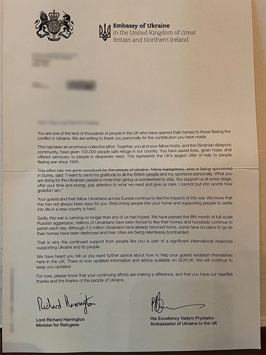 上月底,阿K再接待了另一個烏克蘭四人家庭,到他另一位香港友人的英國物業免費暫住半年。近日他安排該兩個烏克蘭家庭一同聚餐,讓他們互相認識及照應。烏克蘭駐英國大使普雷斯泰科(Vadym Prystaiko)早前去信給阿K,答謝他所付出的貢獻。阿K將信件珍而重之好好收藏。記者問他為何願意如此付出,是否特別同情烏克蘭人遭遇,阿K說,純粹出於想幫助別人,「無特別原因,就係想幫人。如果換着係其他國家嘅難民,我知道嘅話,都一樣會幫。」