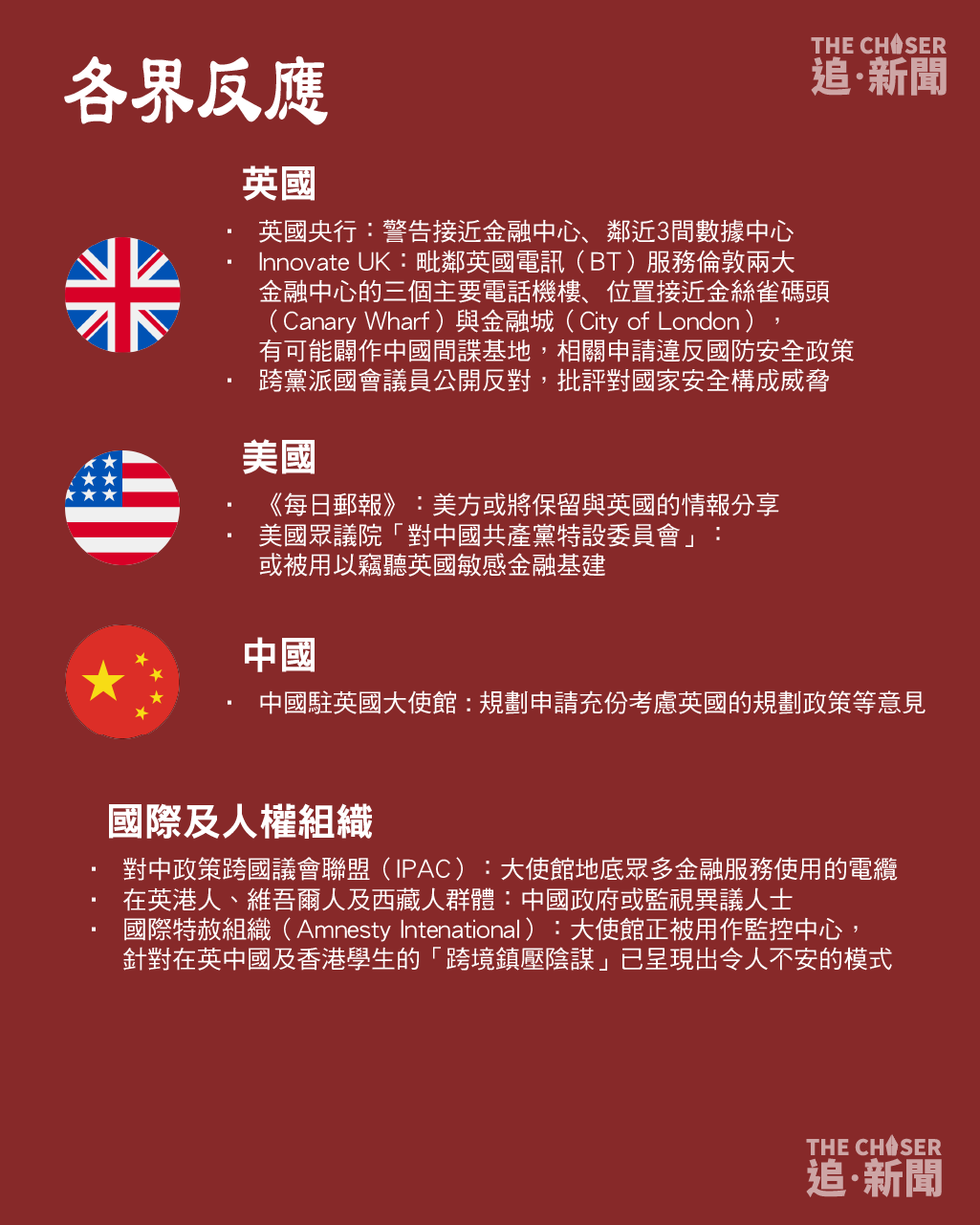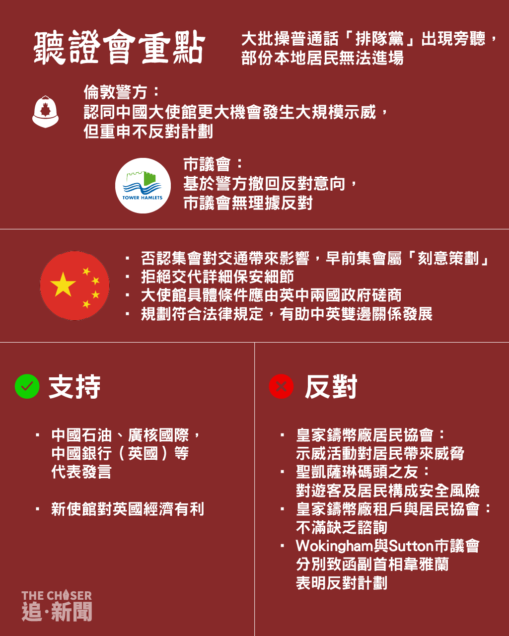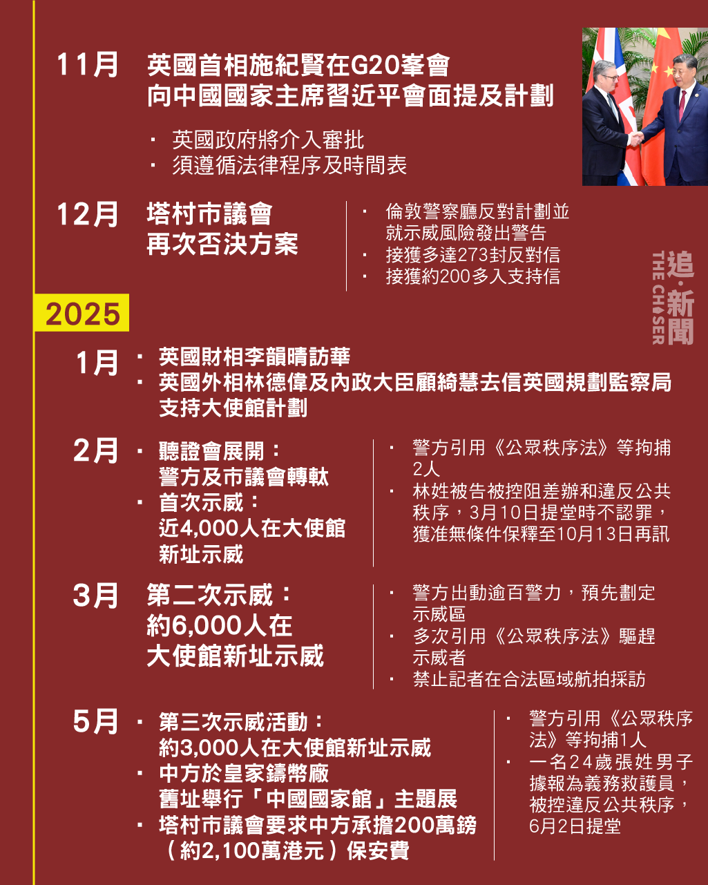 中國計劃在英國倫敦皇家鑄幣廠舊址興建境外最大「超級大使館」,事件引發政界、居民及人權組織等齊聲反對。自中國2018年購地以來,規劃申請已經歷塔村市議會(Towe Hamlets Council)兩度否決﹑英國政府宣佈介入審批、展開公聽會及引發數次大規模示威,爭議焦點覆蓋國家安全及跨境鎮壓等議題,而隨着英國政府即將作出最終決定,事件也步入關鍵時刻。