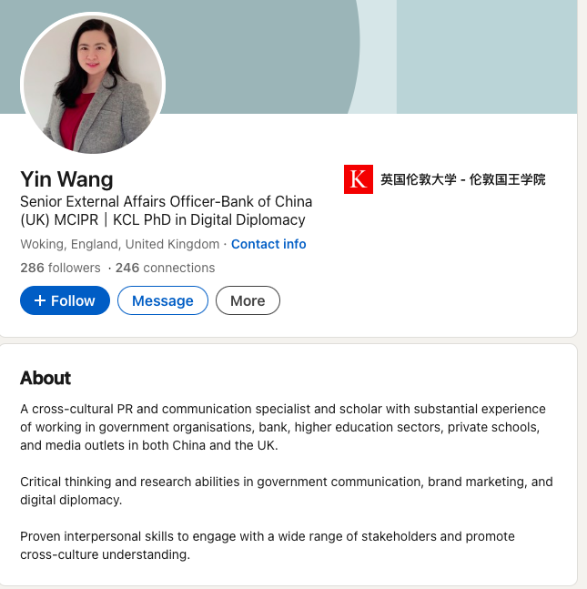 在中國銀行(英國)擔任高級對外事務主任的Yin Wang,以「英國中國商會」(CCCUK)身份發言支持中國大使館計劃。她指有反對者以所謂「中國人權問題」為由反對新館建設,根本與規劃政策考量毫無關聯。 她說:「中國在人權方面的進步獲得廣泛認可,與反對者所描述的形象不同。」並列舉在中華人民共和國成立以來,從極端貧困發展躍升至全球第二大經濟體,國民平均壽命由1949年的35歲提高至2021年的78歲,過去40年來,中國成功令8億人脫貧,「中國並不完美,正如英國也並非一個完美的國家,但其進步是不容否認的。」