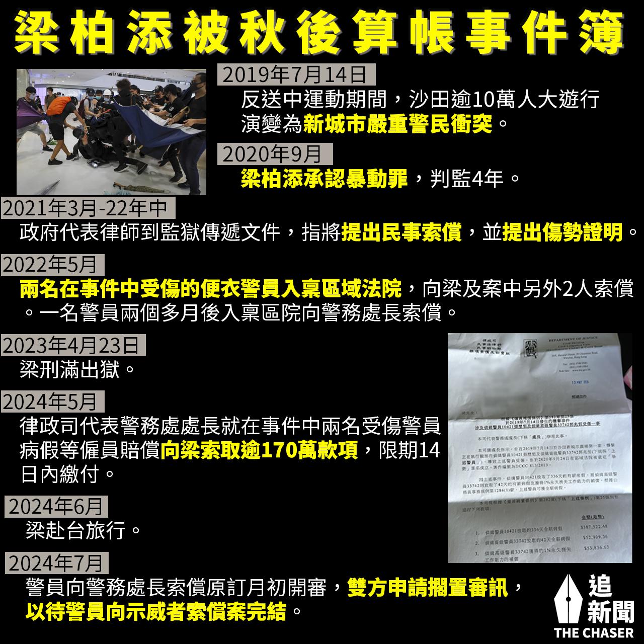 2019年反送中運動沙田新城市廣場警民衝突中承認暴動的抗爭者梁柏添,2024年5月中即他完成4年刑期後1年,收到律政司代表警務處長開出的「罰單」,向他追討案中兩名受傷便衣警員的病假等僱員賠償,金額逾170萬港元,限時兩星期清還,否則梁須承擔法律責任。反送中6.12百萬人遊行5周年,梁離港赴台旅行,目前尋求留台。