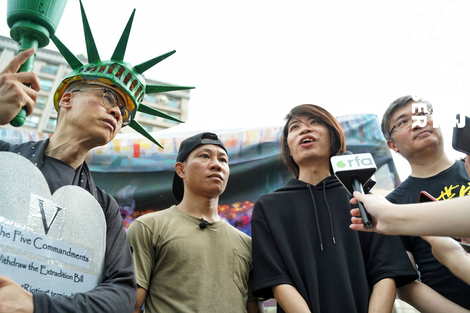 祈求民主與自由,萬世都不朽。在台港人藝術家黃國才打扮成美國自由女神像、手持代表「五大訴求」的「五戒」。遊行期間一名中年男子指罵示威者,隨即被在場警員勸走。他認為,大部份台灣人都是和平、理性及非暴力,惟中共或以黑社會手法引起混亂,台灣人必須警惕。