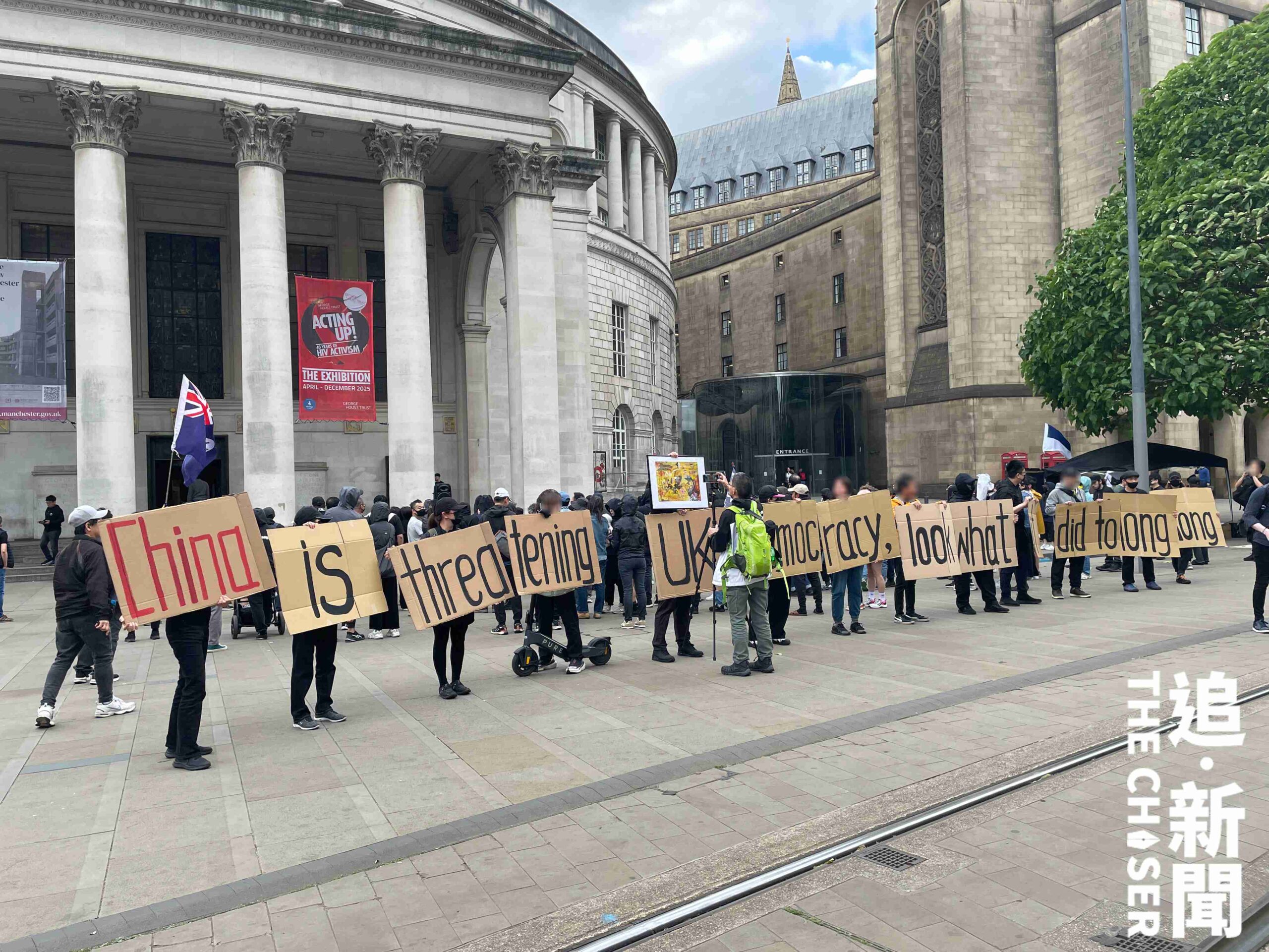 曼城的港人社群過去數年都一直堅持在6.12舉行集會紀念反送中運動,今年亦不例外,周四(12日)傍晚6時在市中心聖彼得廣場(St. Peter’s Square)集會,大約200人出席,部份家長攜同年幼子女一起到場,部份人戴上口罩。大會即場徵集義工組成人鏈舉起紙牌,砌成英文語句「China is threatening UK democracy, look what it did to Hong Kong」(中國正在威脅英國民主,香港就是活生生例子),引起不少途人觀看及舉起手機拍攝。會場亦在地上鋪放了多幅當年示威場面,以及港警濫用暴力的巨型照片。