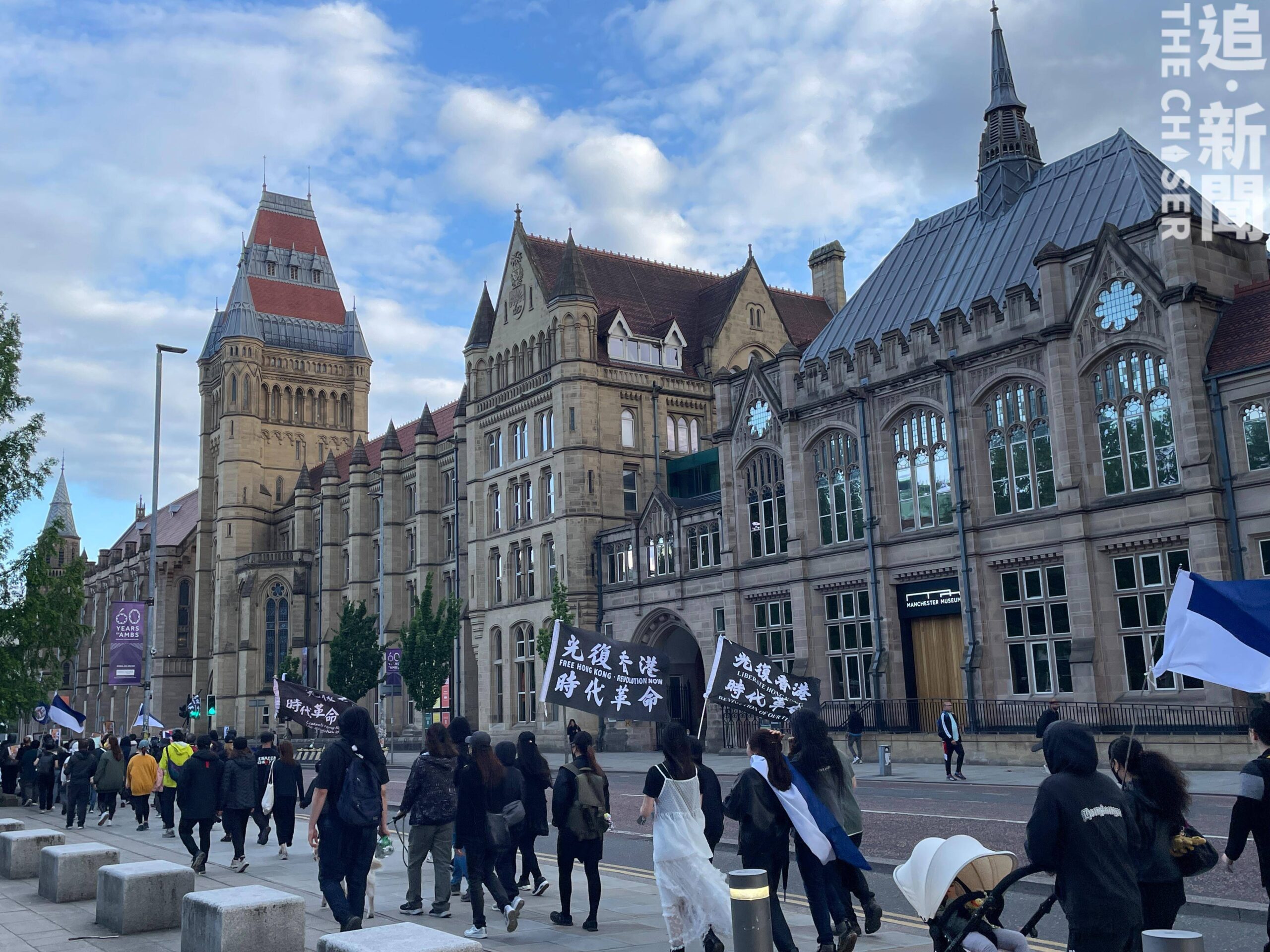 遊行隊伍在集會約大半個小時後起步,前往中國駐曼城領事館示威,隊頭人士拉起一條長約20米、被部份港人視為象徵香港獨立的藍白旗幟,沿途高喊英文口號「Say NO To China」、「Free Hong Kong」、「Hong Kong Independence」,亦不時以廣東話喊口號「光復香港,時代革命」、「香港獨立,唯一出路」,期間經過收取大量中國留學生的曼城大學(University of Manchester)校園,部份相信是中國留學生選擇繞路避開示威者,亦有部份駛過的駕駛人士響鞍向遊行隊伍表達支持。曼城警方則派出一輛警車沿途伴隨遊行隊伍,以應付任何突發事故。