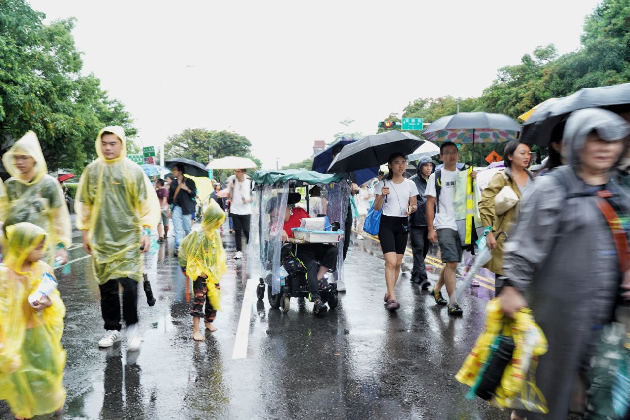 「在台北生活,行人路極窄,經常被機車及私家車擺佔,行人只能被逼行馬路。」和朋友一起參加遊行的在台港生凱迪向《追新聞》表示,他難得在台灣能參與遊行,希望各總統候選人、政黨、民間團體,能持續關注問題,改善道路規劃。他指出,周日下午雖然下著滂沱大雨,但大批家長帶著子女上街,坐輪椅人士仍無懼風雨,爭取「五大訴求」,「還路於民」,場面令人感動,令他不禁想起當年在香港市民撐傘爭取訴求的決心。