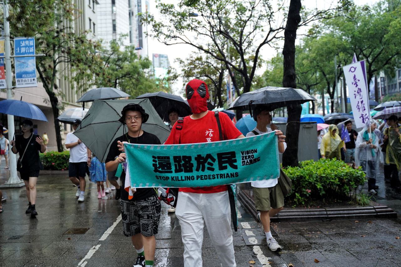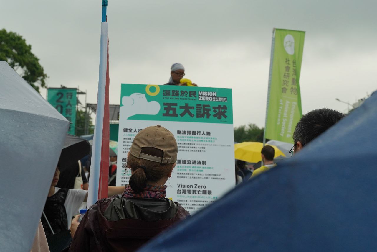 台灣中央社報道,路權團體「行人零死亡推動聯盟」號召的還路於民大遊行周日下午在總統府前凱達格蘭大道登場,現場宣示健全人行設施、改革駕駛訓練、加強執法、通過交通安全基本法及推動行人零死亡等5大訴求。聯盟狠批交通暴力,指遊行要大家用雙腳表達不滿,呼籲政府立刻聽取民眾訴求,展現決心和魄力改革整體交通,實現真正行人零死亡。主辦團體估計約有2.5萬人冒雨參加加爭行人路權。