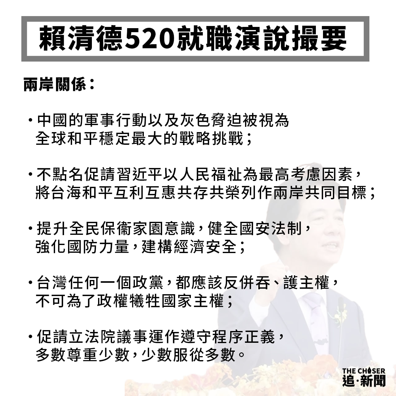自稱為務實台獨工作者的台灣民進黨主席賴清德周一(20日)就任新一任台灣總統,近年遷台港人首度獲邀出席就職禮等嘉賓見證下,賴發表的就職演說,不僅沒有提及中共在茲念茲的「九二共識」,反而至少84次提及台灣,較蔡英文2016年及2020年就職演說更多。他間接表示,中華民國、中華民國台灣以及台灣都是國號,強調中華民國與中國人民共和國互不隸屬。他要求包括國民黨、民眾黨在內的所有台灣政黨反併吞,不可為政權犧牲國家主權。