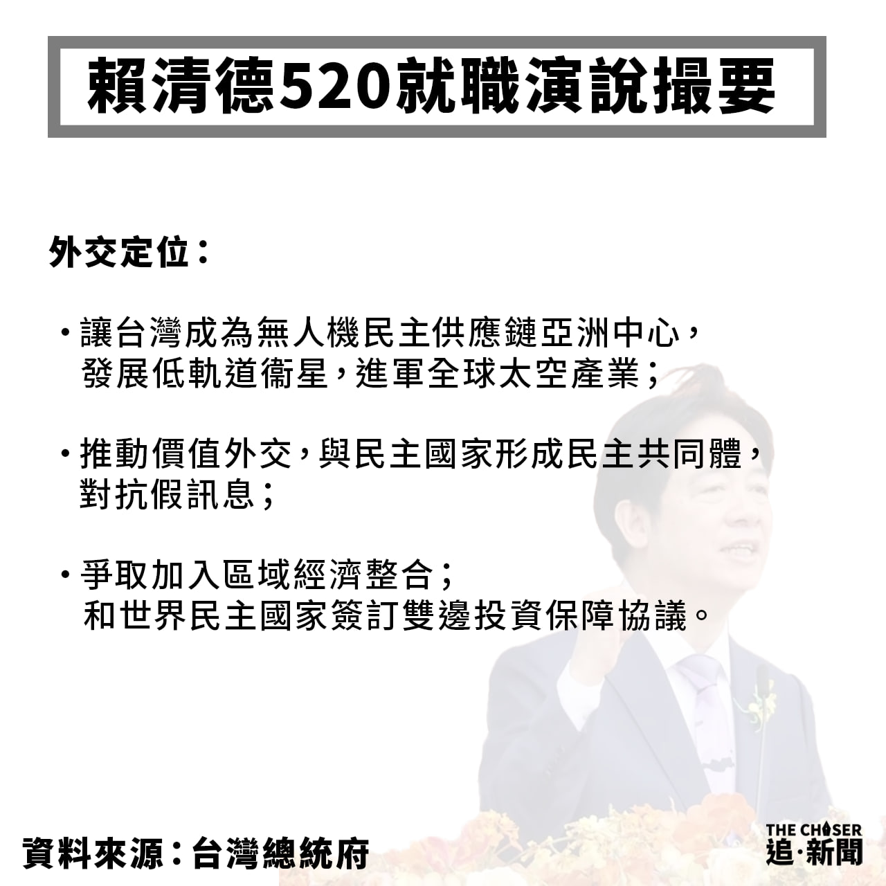 賴表明,希望台灣成為無人機民主供應鏈亞洲中心,並發展低軌道衞星,進軍全球太空產業。他提出推動價值外交,與民主國家形成民主共同體,對抗假訊息,與此同時,台灣亦會爭取加入區域經濟整合;和世界民主國家簽訂雙邊投資保障協議等。