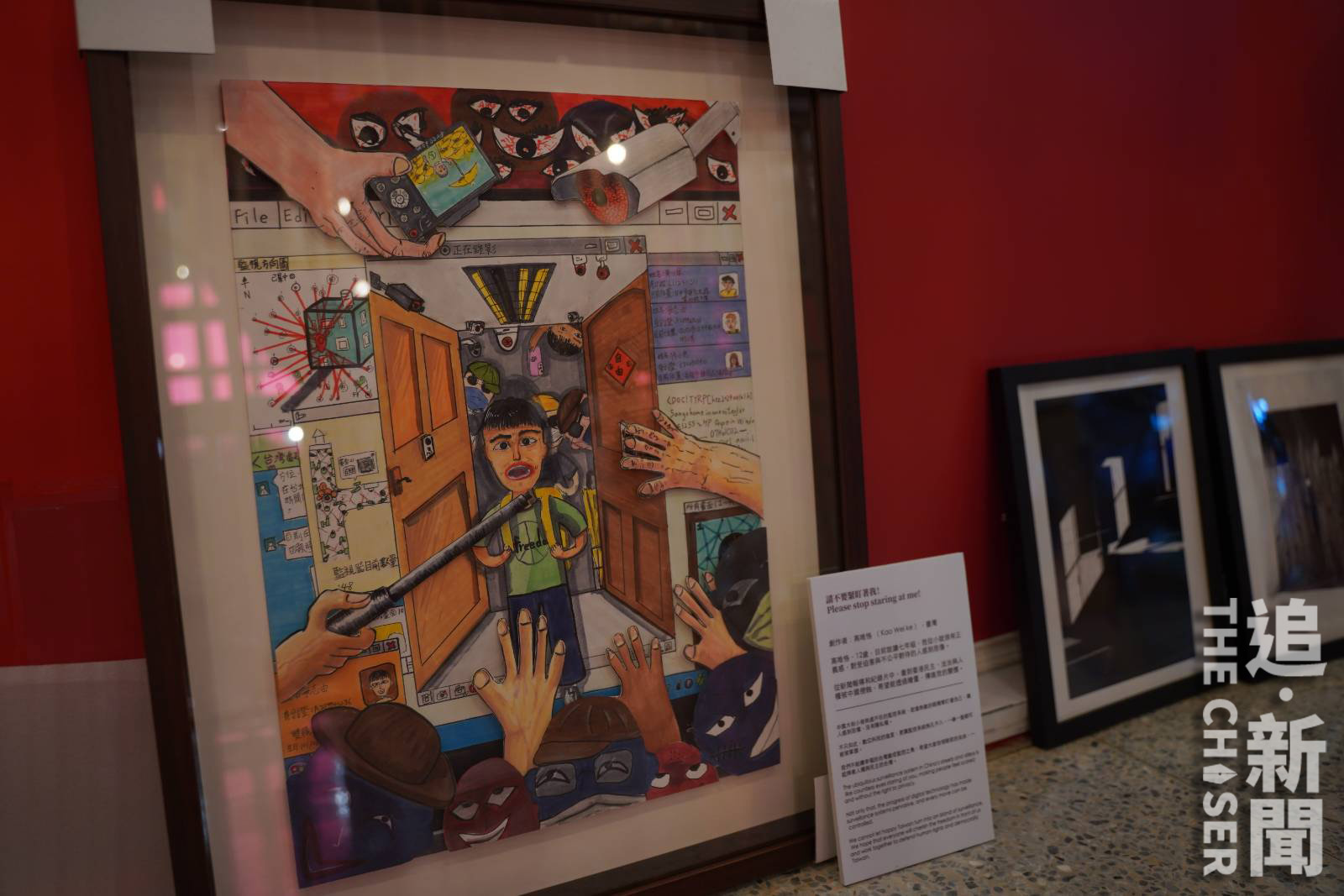 這幅題為《請不要緊盯著我!》畫作由一名台灣12歲初中生創作,是香港人權作品比賽《破窗自由比賽》等參賽作品,是眾多參展作品中令赴湯留下最深刻印象。赴湯引述該名初中生稱,因父母帶他看了一套關於中國監控人民的紀錄片,他感到非常震驚,於是開始關心社會,也關心中、港、台的情況。小小年紀的他,希望透過作品,讓公眾知道中國的街道都佈滿監控鏡頭,「讓人感到恐懼,沒有私隱權」,希望台灣人珍惜眼前的自由,捍衞民主,不要讓台灣成為「監控之島」。