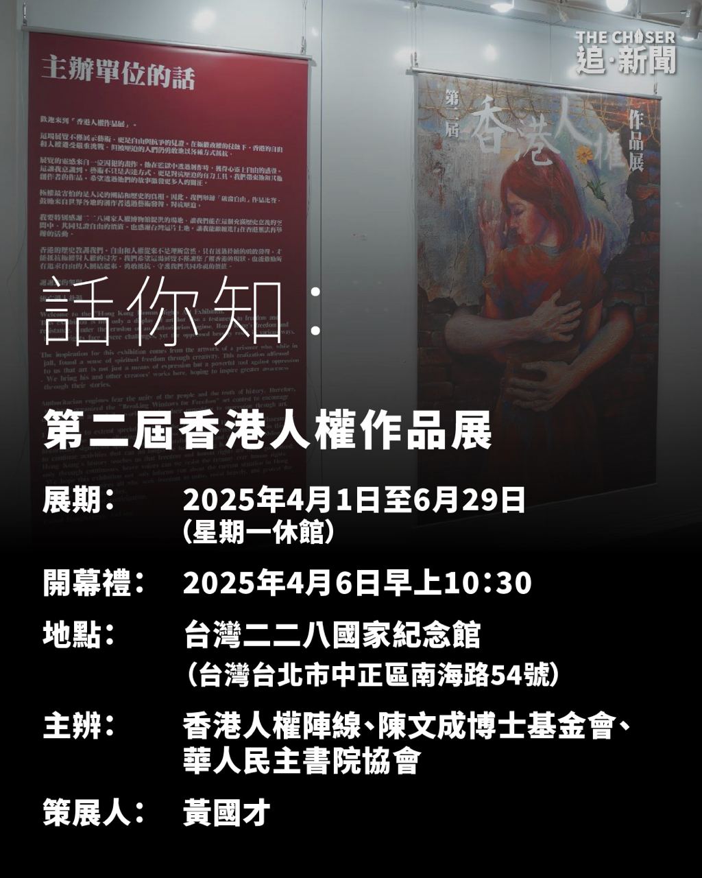 第二屆香港人權作品展周二(4月1日)在台北二二八國家紀念館開幕,今年分別會展出「牆內」手足以及香港人權作品比賽等作品。另外,展覽亦收集百計信件,「牆內人」一直透過書信,討論不敏感的社會事件,以維持自己的良知。受香港《基本法23條》影響,有數名參加者要求展覽主辦人在台灣先找第三者代收郵件以保護自己。主辦方、流亡台灣香港抗爭者「赴湯」湯偉雄表示,這是在23條立法前從未發生的,但深信婉轉地創作是抗爭。