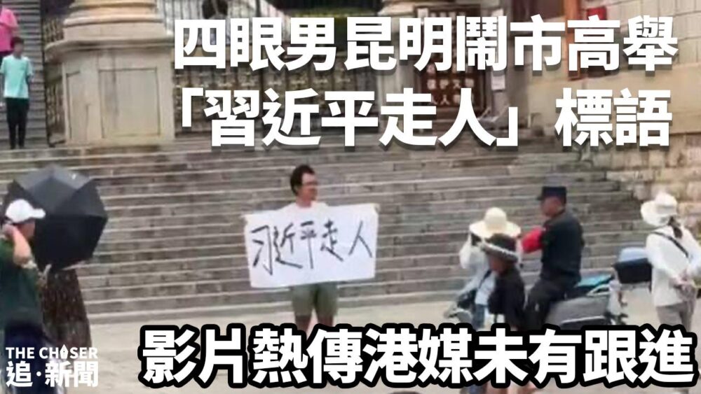 社交平台X的著名帳號「李老師不是你老師」,周三上載一段長約5秒鐘的影片,指有人在昆明抗戰勝利堂的門口,高舉「習近平走人」的標語。從影片所見,該名戴眼鏡的年輕男子,舉起白底黑字的標語,附近人來人往,有途人駐足觀看及舉起手機拍攝;而一名手戴紅袖臂章的保安人員,則騎着電動車停在該男子前,並疑似用對講機匯報情況。帖文並無交代該名四眼男之後的情況,網上亦暫未發現任何就該行動發出的聲明。大陸黨媒全面封殺有關消息,香港傳媒亦未見有任何跟進報道。