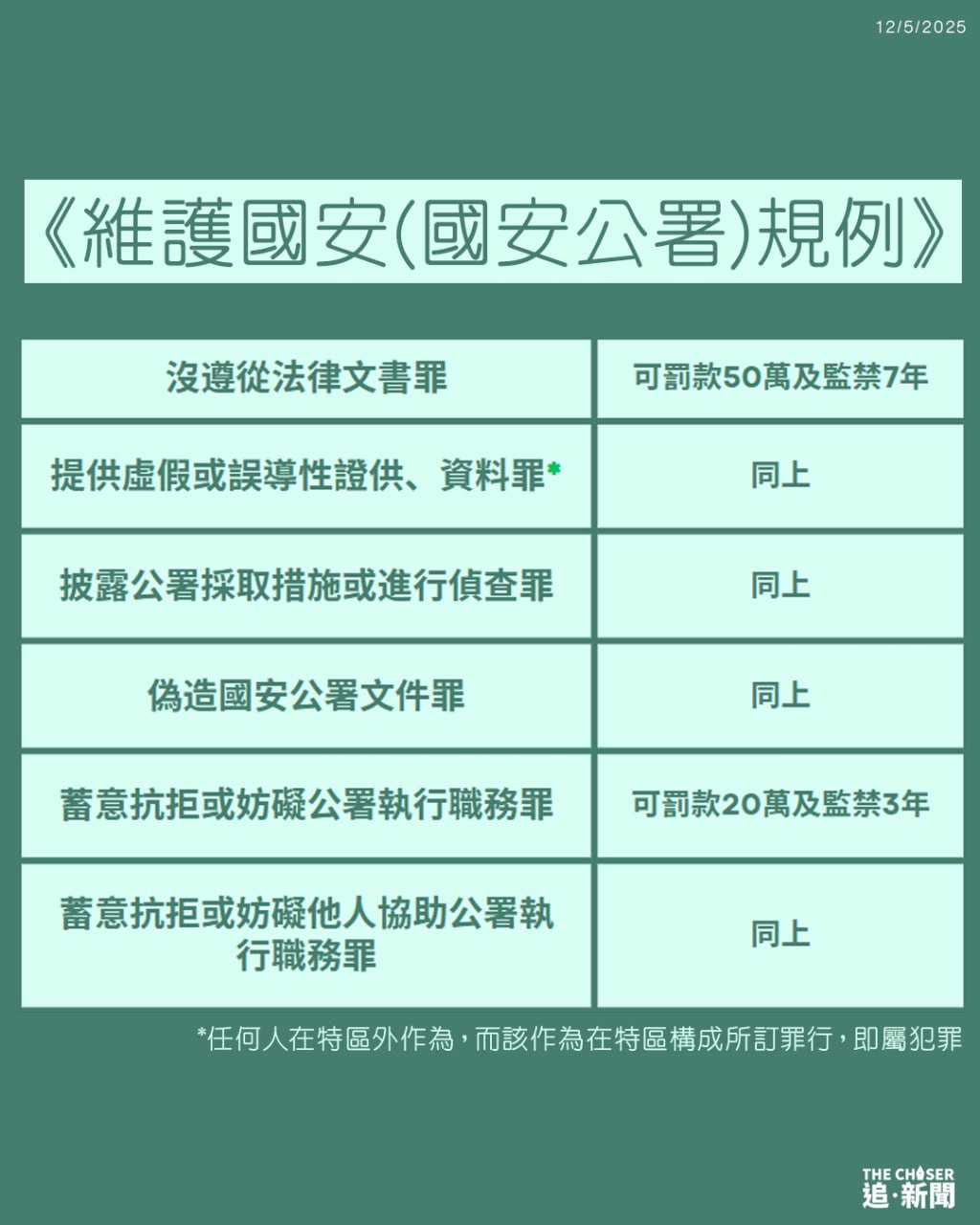 規例亦列出「沒遵從法律文書」罪;「提供虛假或誤導性證供、資料」罪;「披露公署採取措施或進行偵查」罪及「偽造國安公署文件」罪等,可罰款50萬及監禁7年。值得注意的是,「虛假證供」罪具有「域外效力」,任何人在特區外作為,而該作為在特區構成所訂罪行,即屬犯罪。至於「偽造國安公署文件」罪則不屬於公署處理危害國安案件的範疇,而是屬於更廣泛的公署履行港區《國安法》職務的範疇。