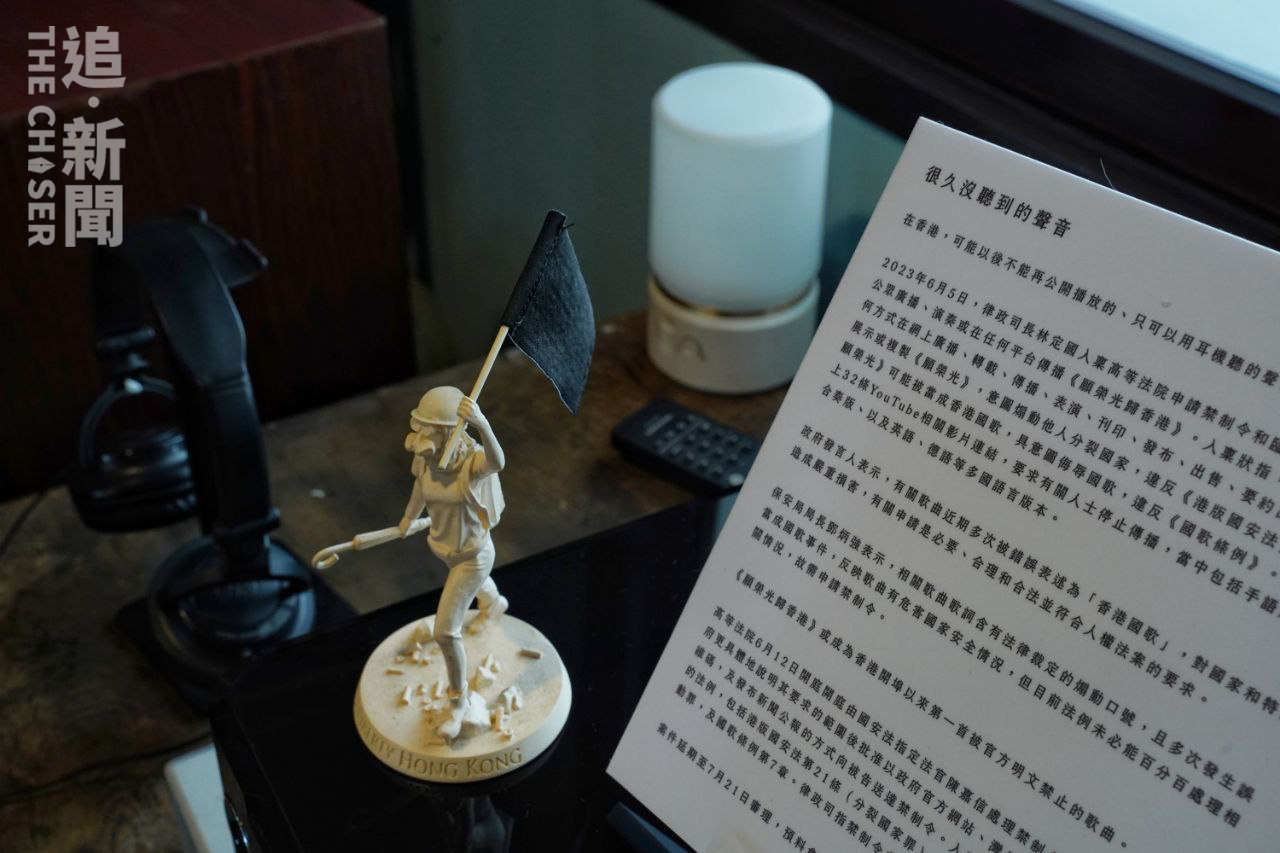 除了視覺效果外,展覽亦有聲音效果,創作者會用廣東話分享作品,並錄下來在展覽場地播出,而展場亦有一房間讓人用耳機播放《願榮光歸香港》,也讓參觀者能夠寫上一些心底話。曉琳相信,有些說話,要用廣東話才能百分百表達出來,例如用國語講光復香港,對講的人與聽的人,感覺都會有很大分別,而言論自由,是要將說話說出來,才能實踐。
