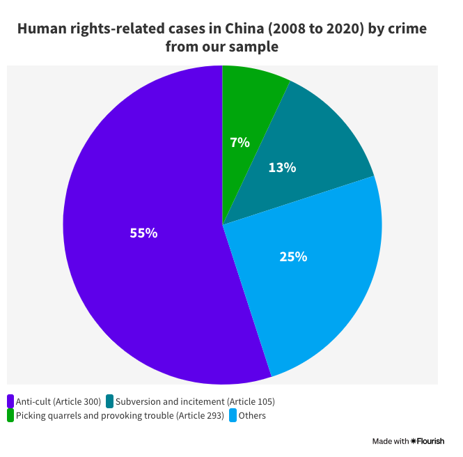 「保護衞士」的調查報道顯示,在2008至2022年間,約有1,400宗與侵害人權有關的刑事案,最常見觸犯的罪名是「妨害社會管理秩序罪」(逾62%),而《刑法》第293條的「尋釁滋事罪」(7%),以及第300條的「組織、利用會道門、邪教組織、利用迷信破壞法律實施罪」(55%),後者則經常被當局用作針對「法輪功」等中共未批准的宗教組織。另有13%案件被指「危害國家安全罪」下的「煽動顛覆國家政權罪」或「顛覆國家政權罪」,該罪名常被當局用作起訴人權律師、捍衞人權活動參與者的罪名。