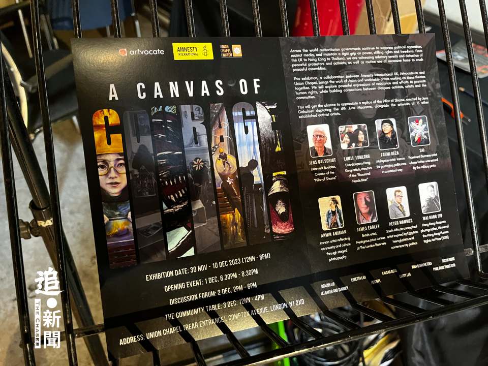 20231130日,倫敦天氣降至C,草地綑了一層銀霜。高志活的團隊由丹麥駕車,穿梭比利時、荷蘭、德國、法國,再經過英法海底隧道,沿途擠在車廂內睡覺,經過24小時長途旅程、中午時分抵達倫敦。為的是國際特赦組織(Amnesty International UK)舉行的藝術展「A Canvas of Courage」,他親自運送「國殤之柱」抵達會場Union Chapel組裝。