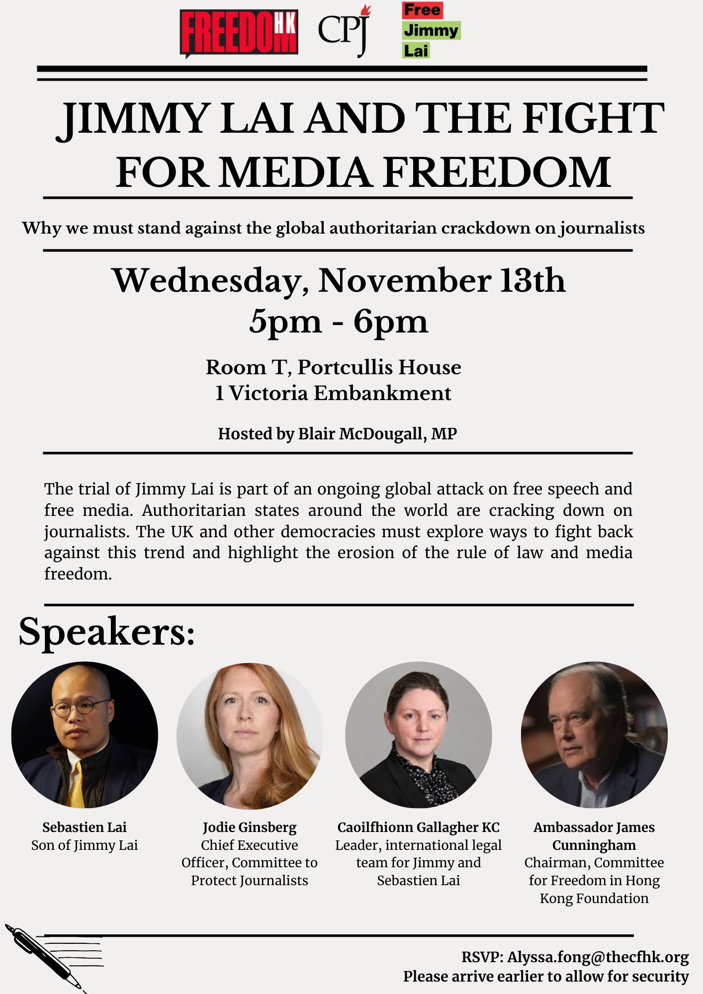 主辦團體:香港自由委員會基金會(Committee for Freedom in Hong Kong Foundation, CFHK);保護記者委員會(Committee to Protect Journalists);Free Jimmy Lai