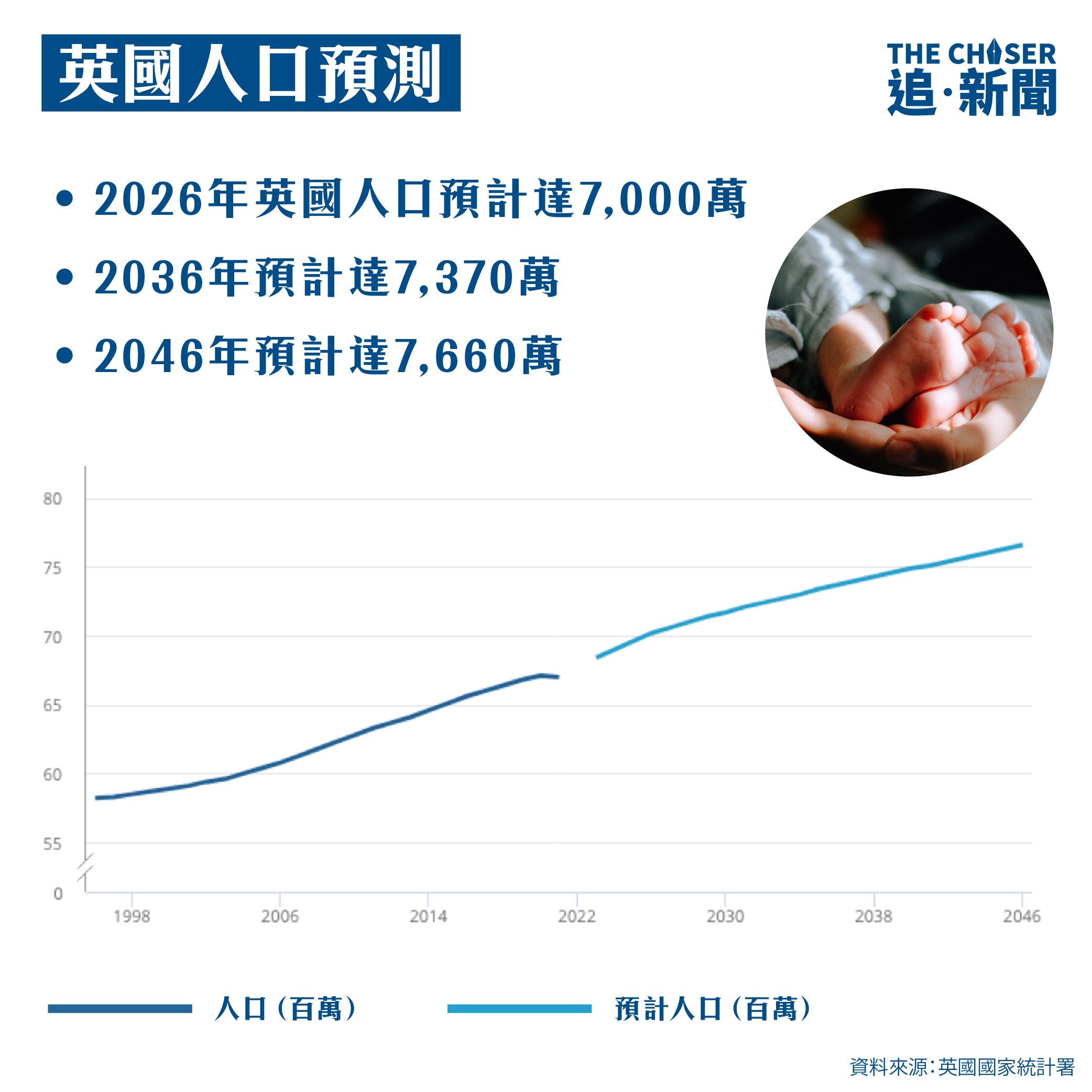 另外英國國家統計局以現時移民水平為基礎,推算英國未來人口,預計2026年人口達7,000萬,直至2046年預計達7,660萬。