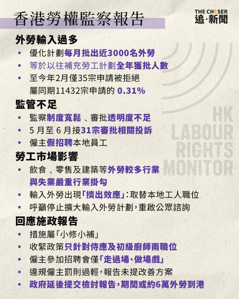 勞權監察組織又批評,特首李家超在最新一份施政報告中,提出的改善措施僅屬「小修小補」,未能真正回應社會關注,呼籲當局停止擴大輸入外勞計劃,重新展開公眾諮詢。